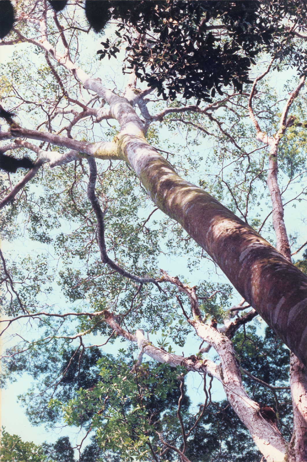 Description: Guapinol trees have perfectly cylindrical and straight, columnar trunks that often measure far in excess of one meter in diameter. Rising from the wide base where low, rounded, root-like buttresses anchor it to the soil, the towering bole continues, unbranched, well past the forest canopy. There, stout and often horizontal limbs spread out widely, creating a hemispherical, umbrella-shaped crown of moderate to thin density. Guapinol bark is smooth and gray (though often mottled by a variety of multicolored lichens), with finely textured vertical cracking evident upon close inspection. At times, accumulations of the tree’s thick, clear-yellow, resinous sap are visible around breaks in the bark.