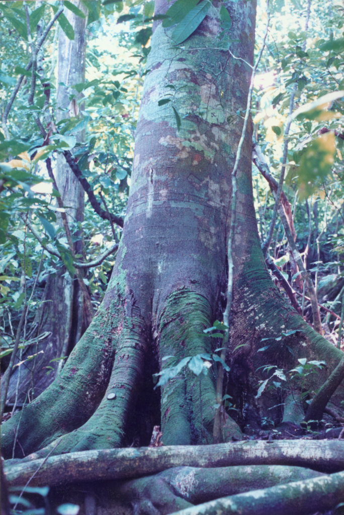 Similar Species: Cynometra hemitomophylla (Guapinol Negro – see description) has similarly shaped, paired, asymmetrical leaves. In general, they are smaller, more tapered and more pointed than those of Hymenaea. Also, the Cynometra tree itself is less massive – almost never reaching a meter in diameter and attaining only canopy height. Hymenaea lacks significant buttresses, while Cynometra nearly always sports well developed roots of this type.