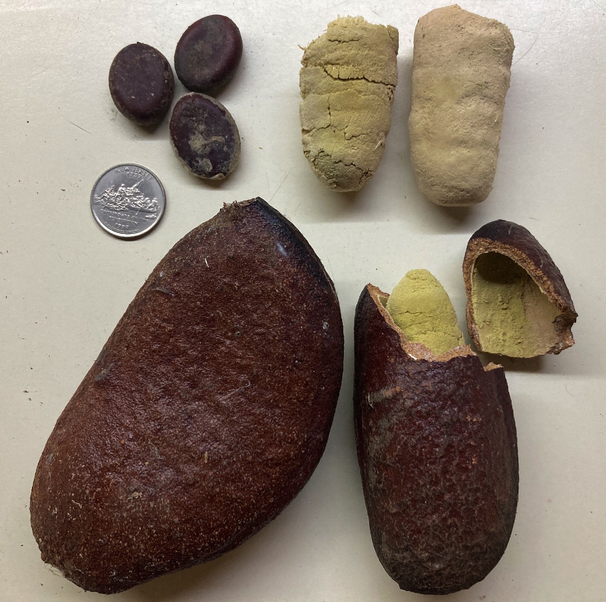 Fruits grow rapidly from the flattened, angular ovaries and reach full size within about six months. However, they remain in the canopies a full 14 months before harvest commences. Fruits mature as large (15 cm by 8 cm by 5 cm), reddish-brown, somewhat lobed pods (only slightly resembling a human toe). Inside the indehiscent pod’s thick and woody outer wall, three or four black, ovoid seeds (3 cm) are surrounded by a dry, fibrous, tan-colored powder. Though unpleasant to smell, this filling is edible and sweet and has a date-like flavor. Fruit harvest begins, slowly, in late February and reaches full force in March and April. Seeds germinate immediately with the first rains of May and June, provided the thick seed coat has been scratched to allow hydration. New seedlings, 20 cm tall with pink stems and sporting a pair of disc-shaped leaves, are easily recognizable.