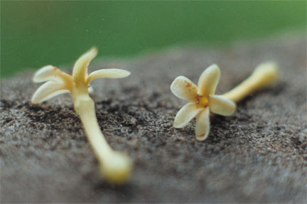 Description: A small to medium sized tree, Lacmellea has a straight and cylindrical (truly columnar) trunk that may reach 40 cm in diameter. Larger trees may also sport low, rounded, and short buttresses that barely widen the base of the bole. Clad in smooth, gray-brown bark, the trunk is frequently mottled by colonies of flat, blue-gray lichens that seem to prefer this species. All Lacmellea surfaces exude large amounts of thick, white latex when broken. Along the upper third of its length, the monopodial-like trunk gives rise to many, relatively short, thin branches that leave the bole horizontally but then droop under their own weight. The crown they produce is at once narrow and moderately thick. Simple and opposite, Lacmellea leaves (12 cm by 4.5 cm) are narrowly elliptical in shape. Each glossy, light green blade bares a contrasting pattern of yellow, pinnately arranged leaf veins. Flexible and soft as well, the blade is supported by 1 cm petiole and ends in a 1 cm drip-tip. Most new foliage is generated from branch tips in December and January. Flowers (3.5 cm by 1 cm) appear in small, axillary cymes bearing from one to six blossoms each. Based in a cup-like, five-point, green calyx, a long, creme-colored tubular corolla (3.5 cm) dominates each blossom. This corolla sports two marked swellings: one at its base and the other two-thirds the way along its length. Just past this second swelling, the corolla flares into five, yellowish and finger-