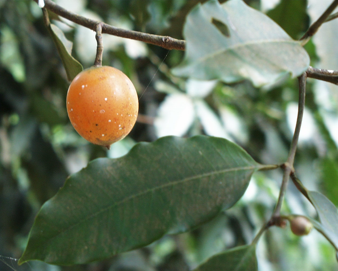 like petals. An equal number of stamens are attached to the corolla, though hidden from view within it. Sporadic flowers may appear at any time during the year but the most intense and synchronized blossoming is confined to the months from February to April. Fruits (4 cm) are rounded – nearly spherical – drupes, often ending in sharp, distal points. Initially green and glossy, many of them begin to accumulate in the Lacmellea crown after flowering, reaching full size quickly and persisting there for many months before ripening. Slowly and individually, the fruits turn bright yellow and fall from the trees. Inside each, a thick layer of soft flesh surrounds two seeds. Though not all individuals within a given population participate, many trees possess large numbers of fruits all year long, harvesting continuously – but slowly – throughout this time.