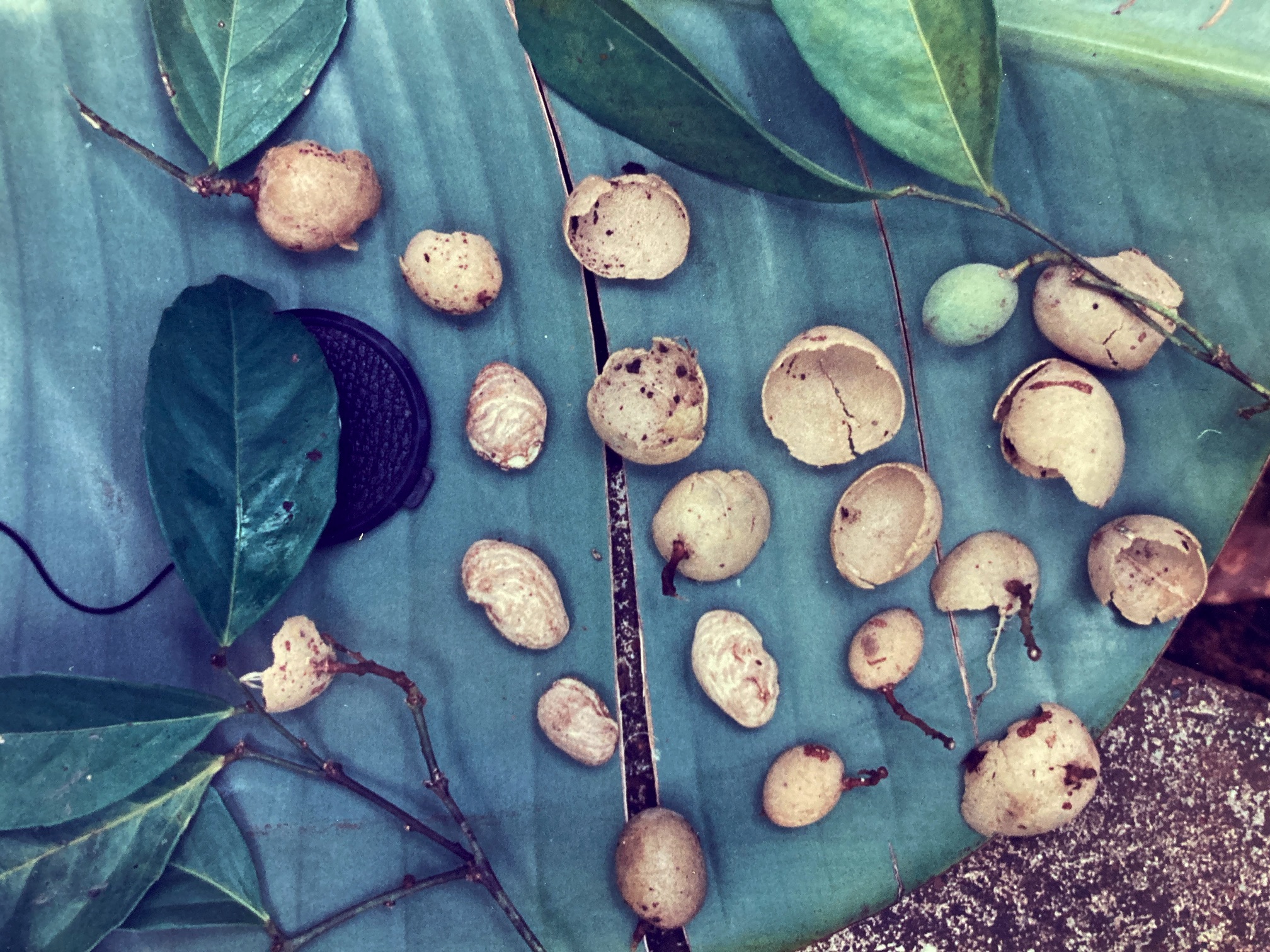 The strong similarity between Caja fruits and small bird eggs is probably more than coincidence. Bird eggs are a popular food item among many arboreal mammals, snakes, and even larger birds. Perhaps this is an example of mimicry in the plant kingdom, where the Caja tree takes advantage of the established popularity of a pre-existing common food item in order to help disperse its own seeds. Caja fruits are actively sought out and eaten by many animals in Manuel Antonio (such as raccoons). This is evidenced by the litter of shells and seeds on the forest floor during harvests as well as the myriad broken fruits that persist in the canopy. Immature fruits are sometimes ripped from the branches and then discarded – apparently by birds or mammals impatient for a good meal.