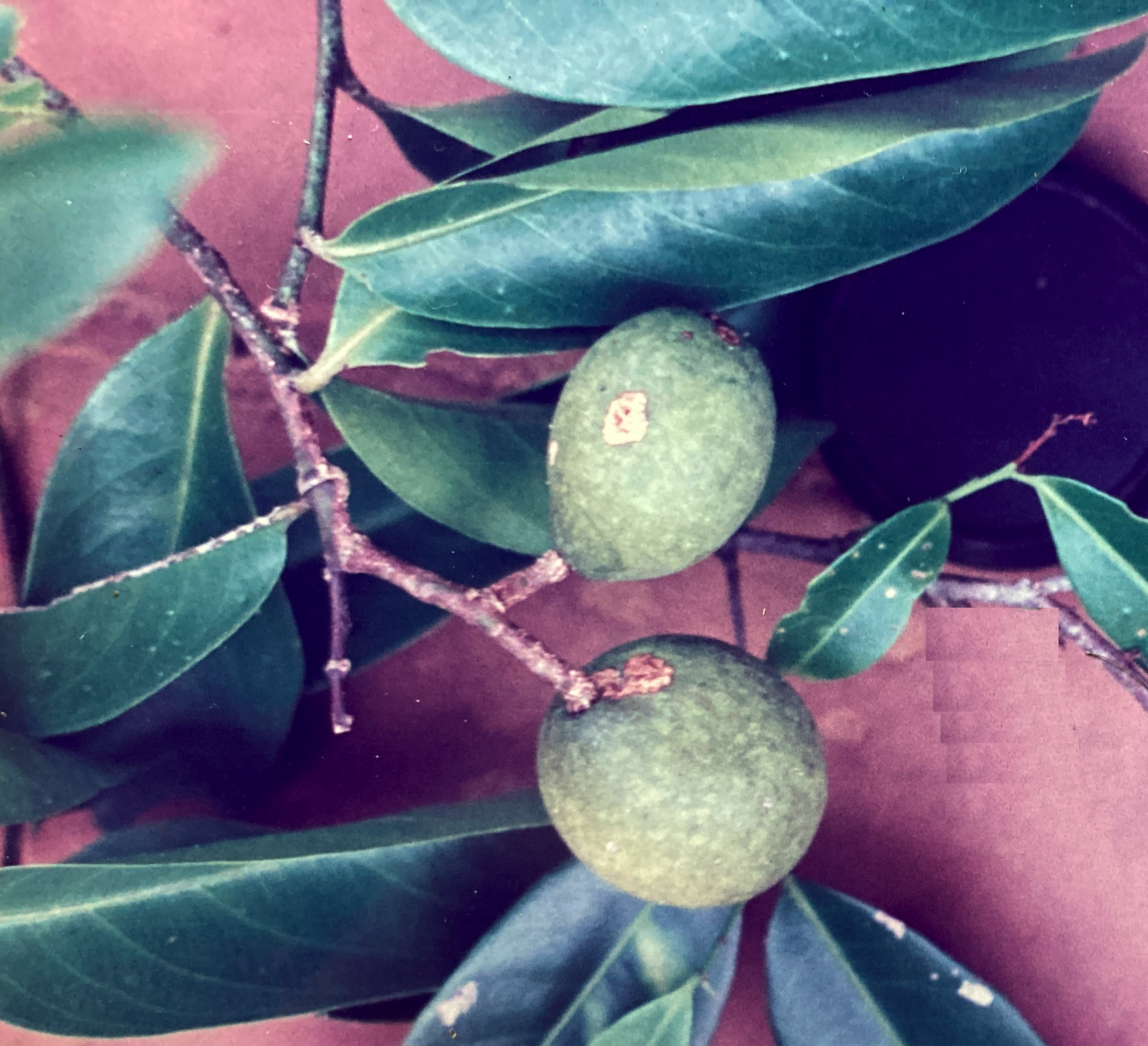 Fruits grow rapidly thereafter, but many are aborted during all stages of their five month development. They mature as 4 cm, ovoid, green drupes (resembling small avocados) with a thin layer of flesh surrounding a large, stony seed. When ripe, the fruit is soft and sweet smelling. Harvest begins in the last days of June and continues through the beginning of August. Seeds germinate within two months of fruit fall (typically in September) and the seedlings – using the stored food in the large seed – grow twenty centimeters during their first two weeks of life. The young saplings are easily distinguished from the other vegetation of the forest floor, thanks to the presence of small, linearly arranged dots on the small tree’s leaves.