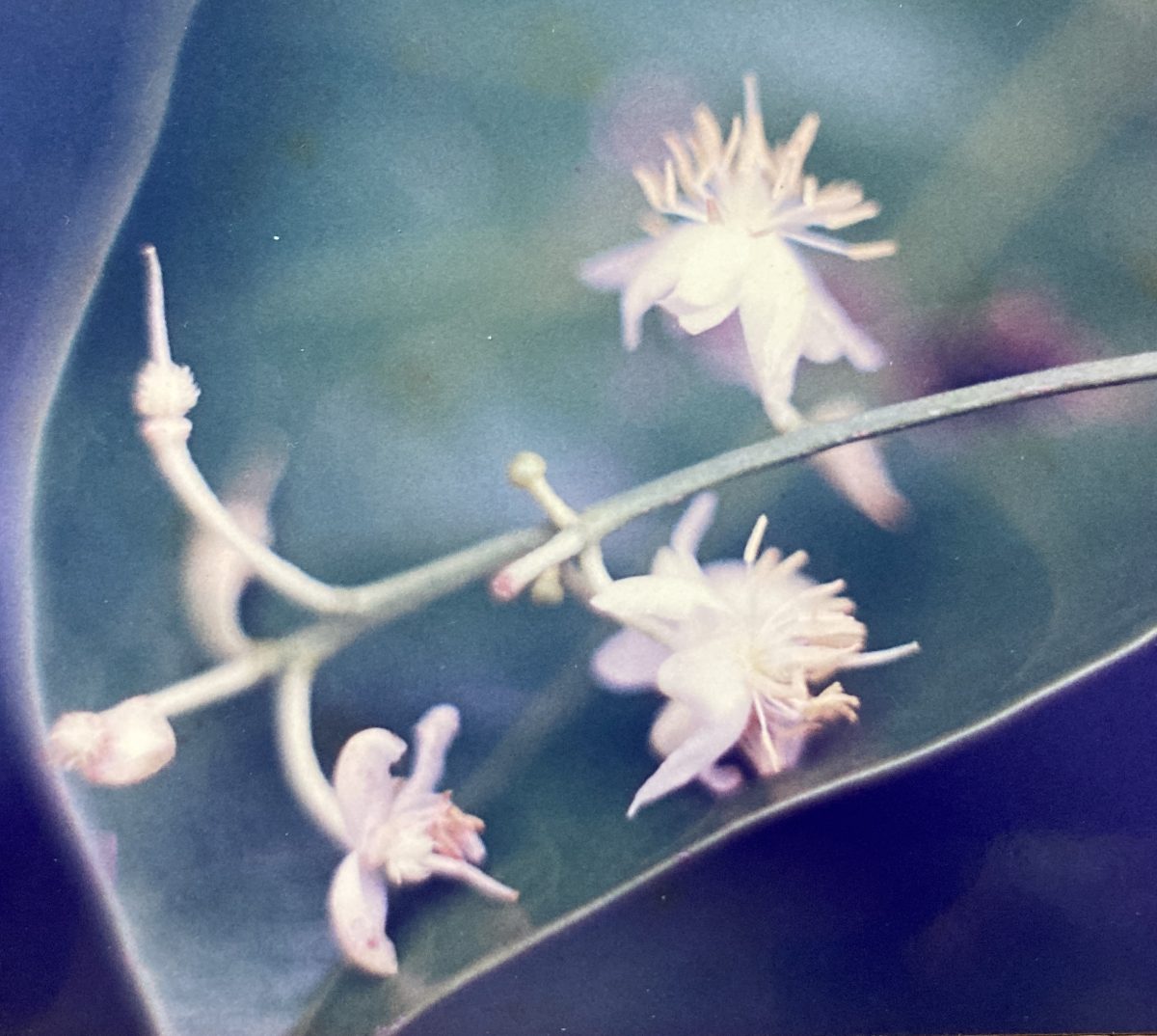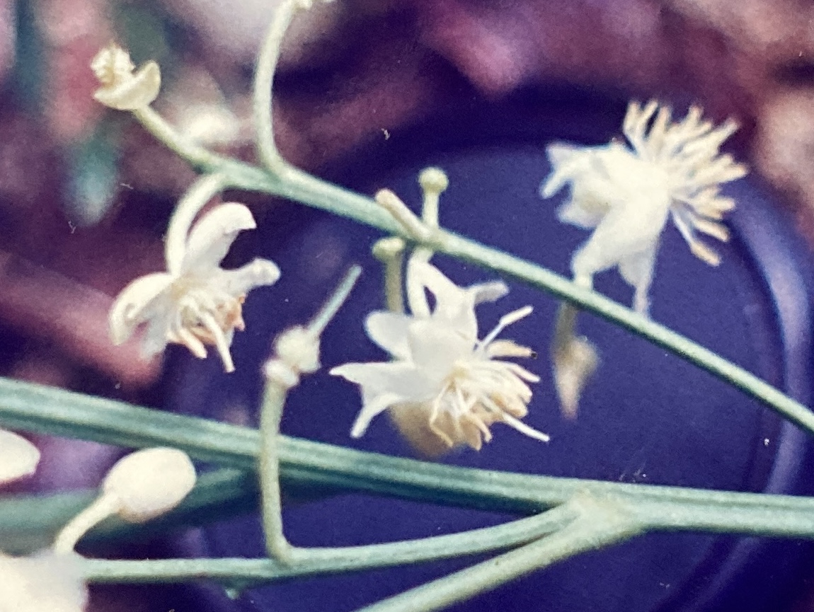 Snow white flowers (1 cm) grow from small, axillar panicles. Each is composed of eight narrow petals that are bent backwards, exposing a central cluster of 16 yellow-anthered stamens and a slightly longer white pistil. Three, cupped and scale-like sepals compose the calyx. Flowering behavior in this species is erratic, occurring in several bursts of activity between early August and early October.