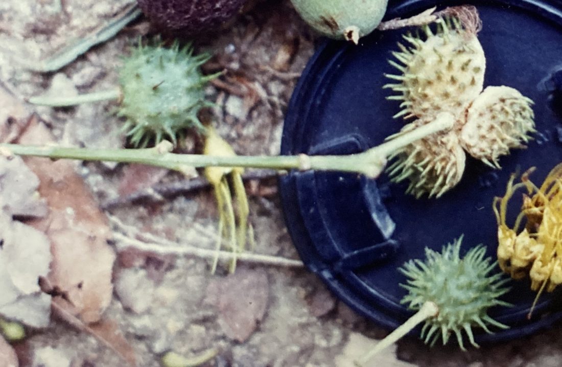 Fruits (2 cm) develop as green, globular capsules covered with stubby, rubbery spines. Upon ripening, each divides into three fleshy sections, revealing as many small, orange-ariled, black seeds (5 mm) inside. Harvests last from December through February.