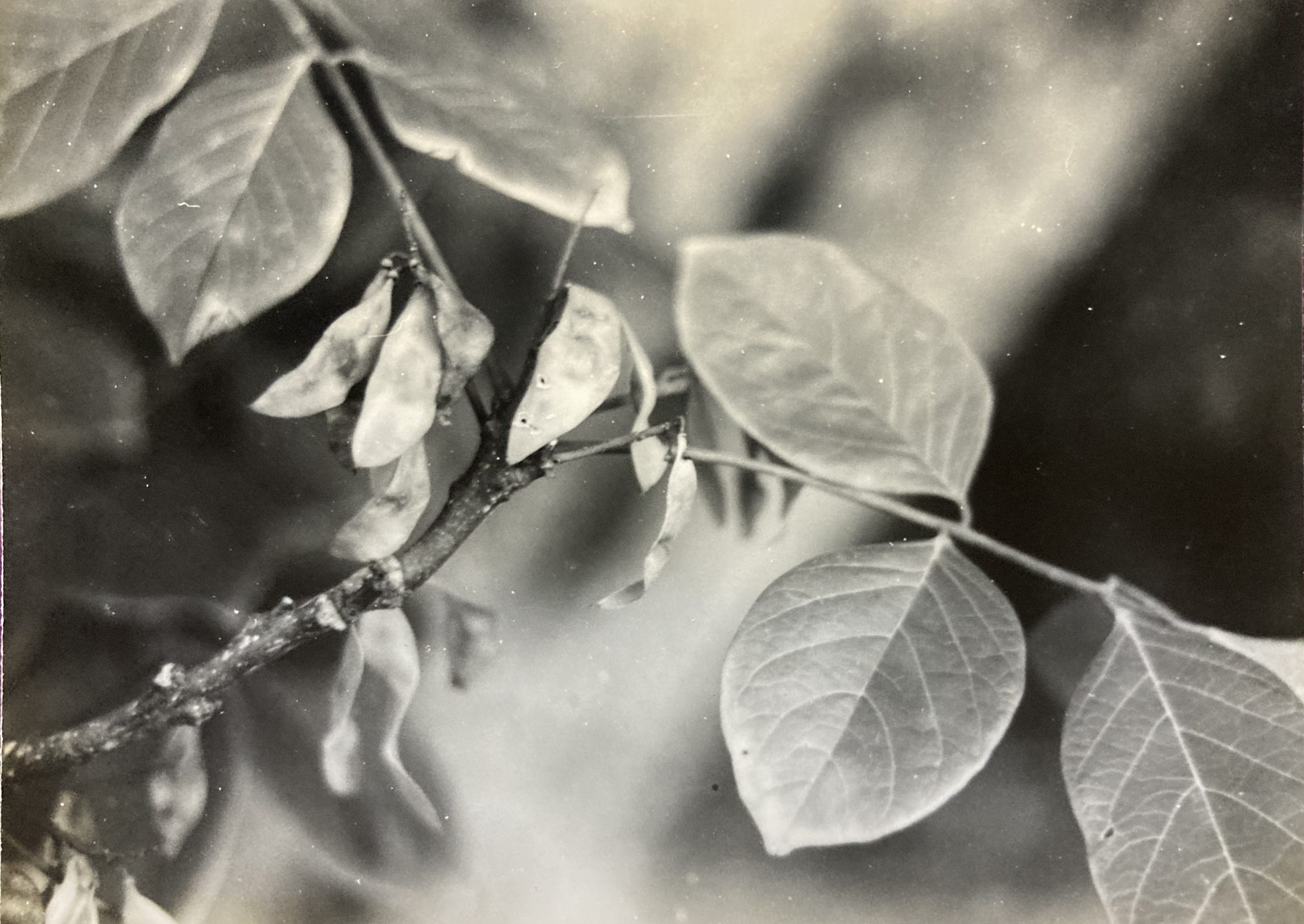 Leaves (40 by 28 cm) are compound, imparipinnate, and alternately arranged. Each possesses 7-9 smooth leaflets of variable size and shape. Increasing in size with distance along the petiole, leaflets reach a maximum length and width of 16 by 6 cm. Their form is elliptical or more often oblanceolate, with stubby drip tips in evidence. All foliage is shed in February or March and new leaves begin to grow almost immediately thereafter.