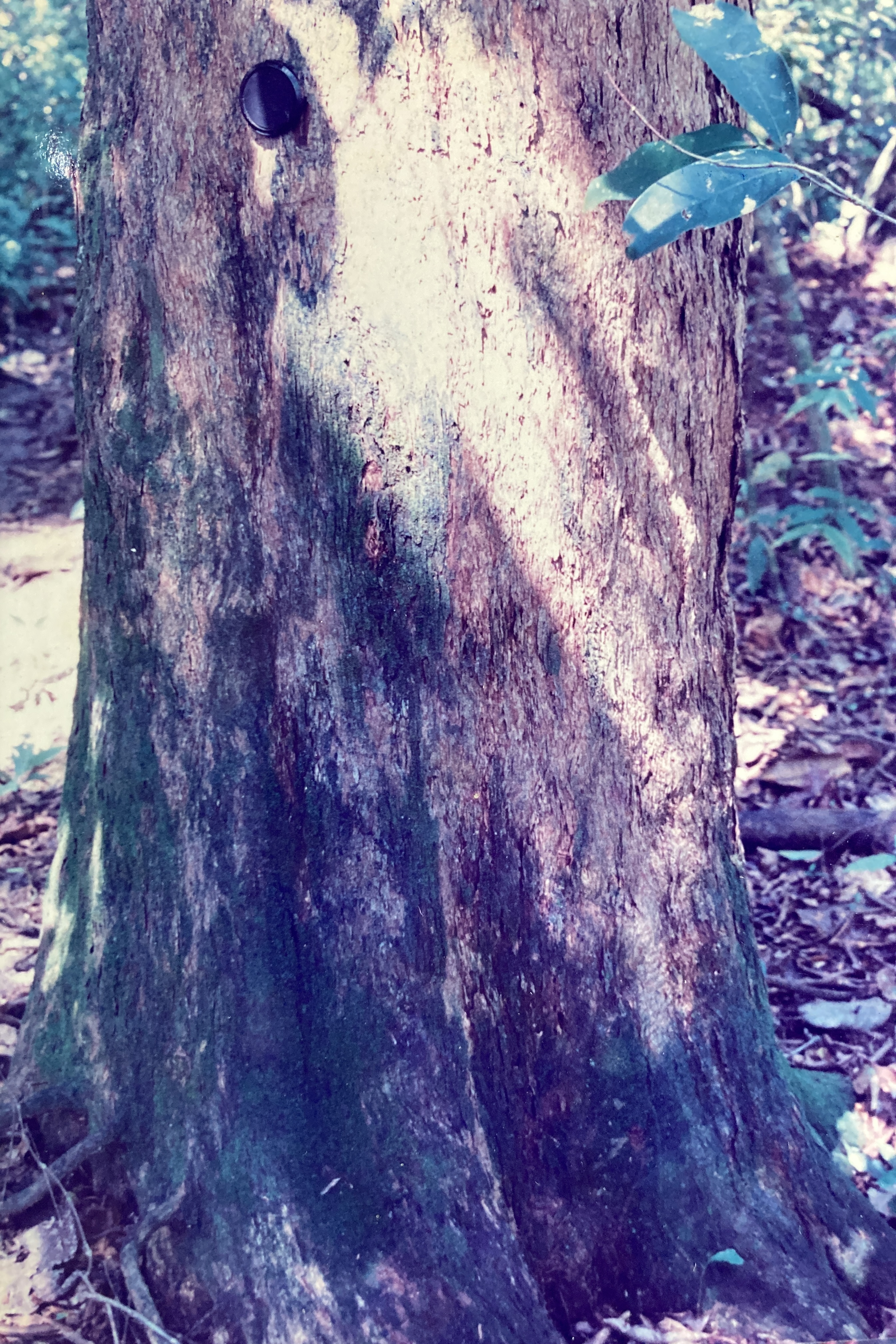Description: The Manteco trunk (60 cm) is mostly round in cross-section, with only shallow, sinewy bulges to texture its surface. Less than columnar, these boles show a tendency to be bent and angular. The thin, papery, tan-colored bark is finely textured by hairline cracks that cut vertically and cause it to exfoliate in narrow strips. Branching occurs along the trunk at relatively low levels. All limbs extend outward in an angular, almost erratic, pattern, and sub-divide into thin, grayish, flexible twigs. Manteco foliage is generally restricted to the last 15 cm of these twigs, the bulk of the branches remaining leaf-less. Overall, the Manteco crown is very thin, open, and airy.