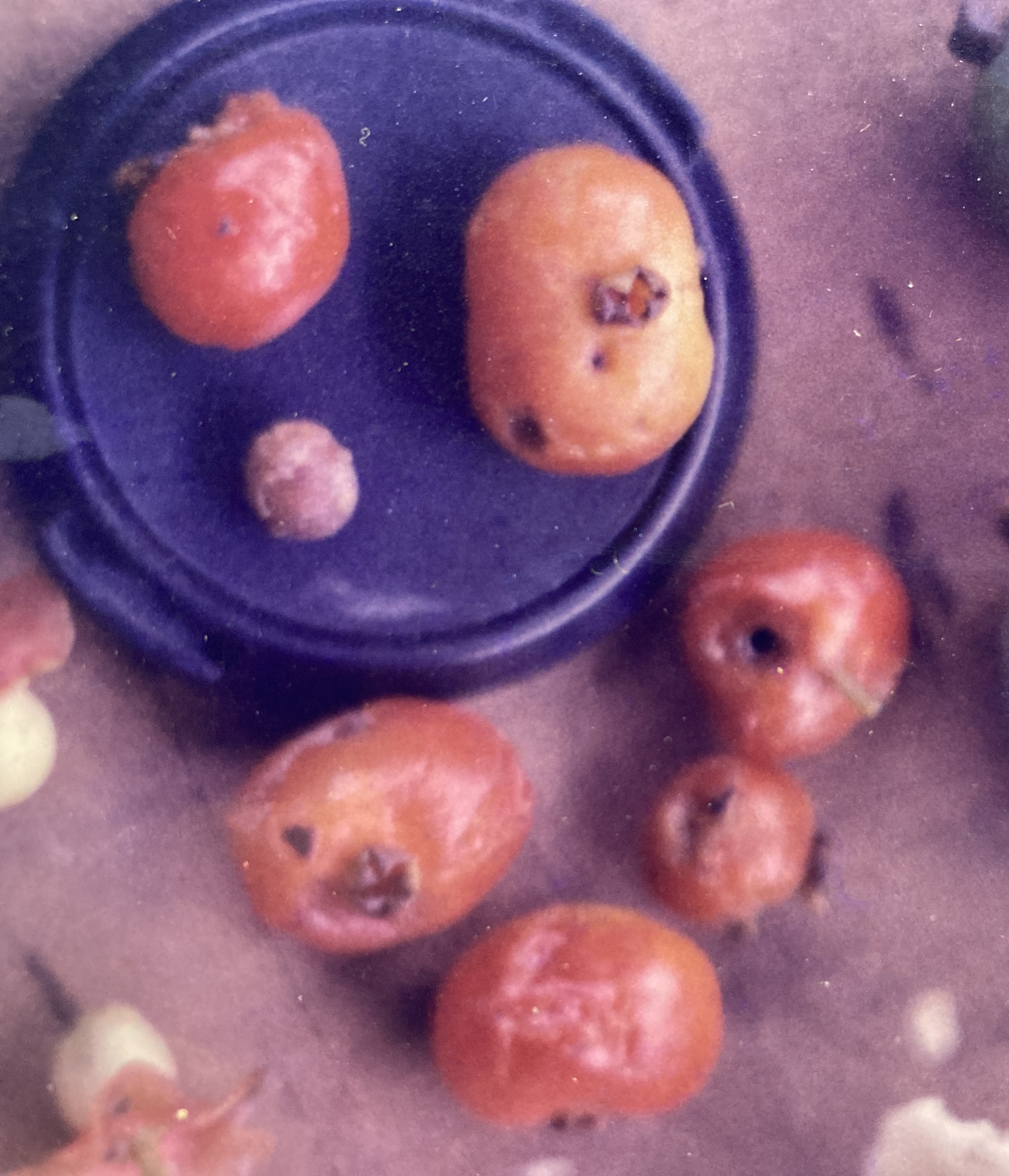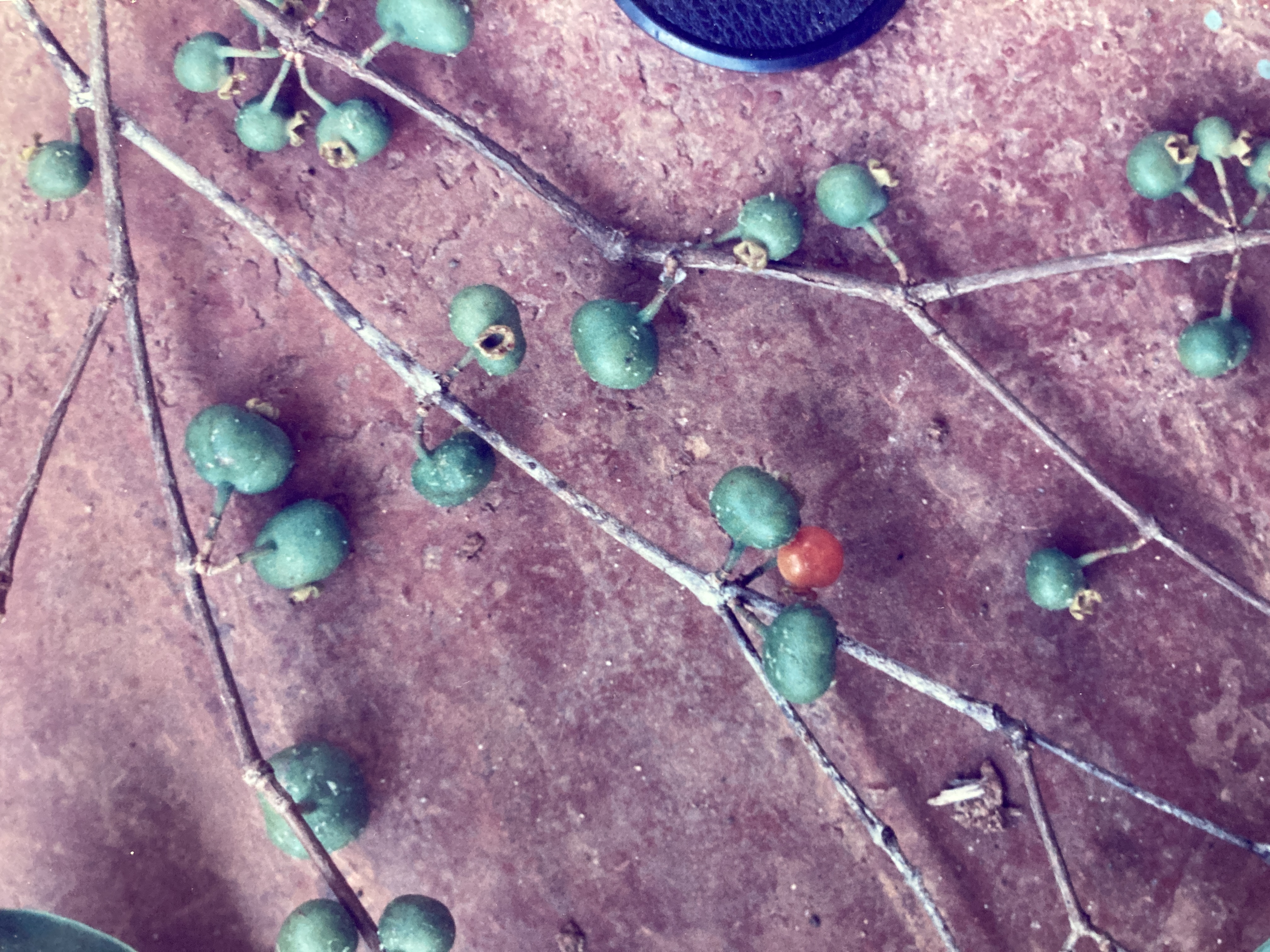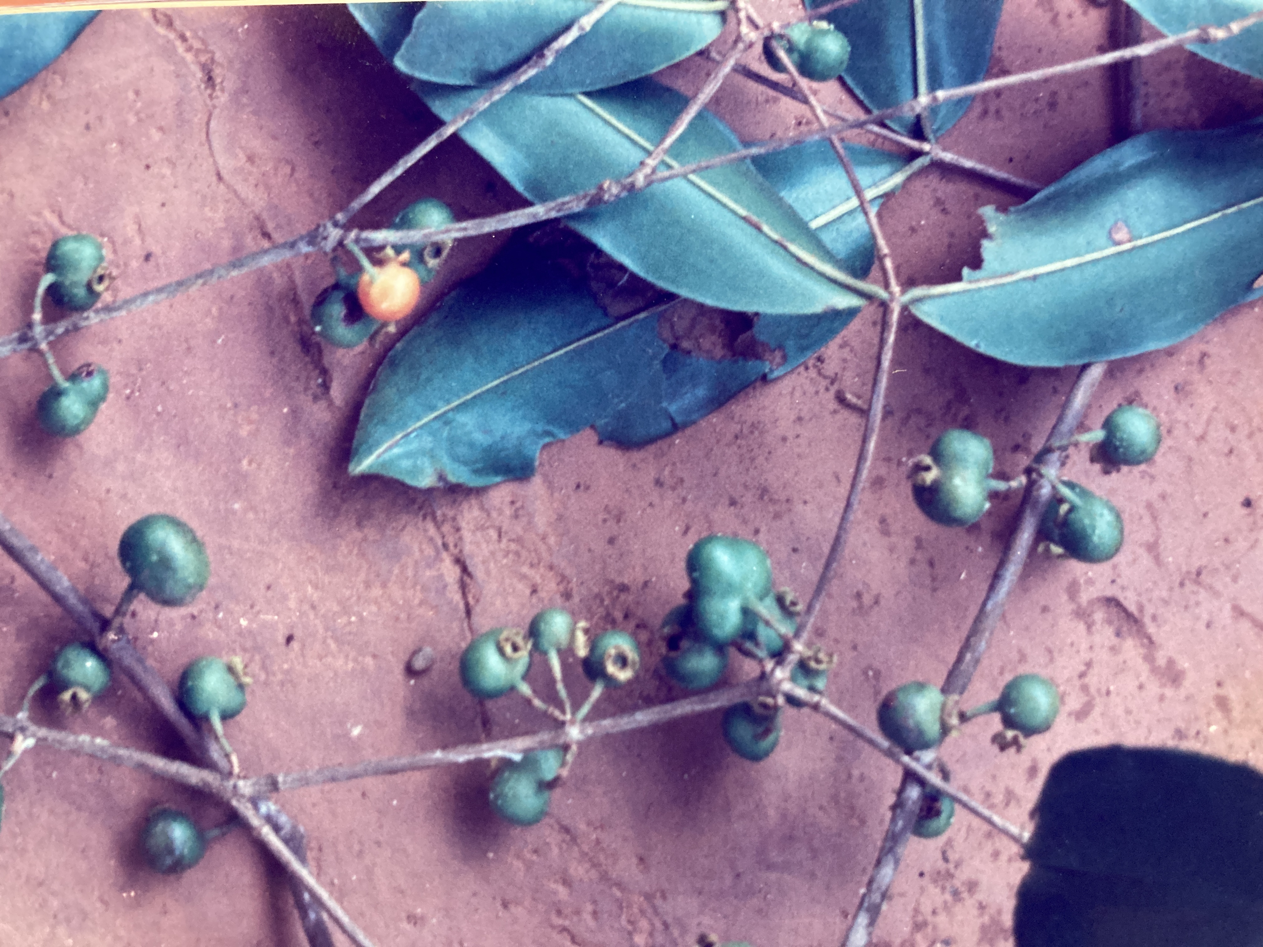 Manteco fruits expand rapidly from the inferior ovaries after the flowers die. They become fleshy, irregularly shaped and lobed – though basically globular – drupes, that ripen as they turn from green to red in the trees. Distally, the stellar calyx persists, adoring each mature drupe. Fruits vary greatly in size and though they average about 2 cm in diameter, some trees consistently produce giant 4 cm orbs. From two to four, hard-coated, popcorn-shaped, dull brown seeds (0.5 cm) are found in each drupe. These germinate within a month or two of fruit fall, though seed viability in this species appears to be quite low. Harvests occur annually from November though January.