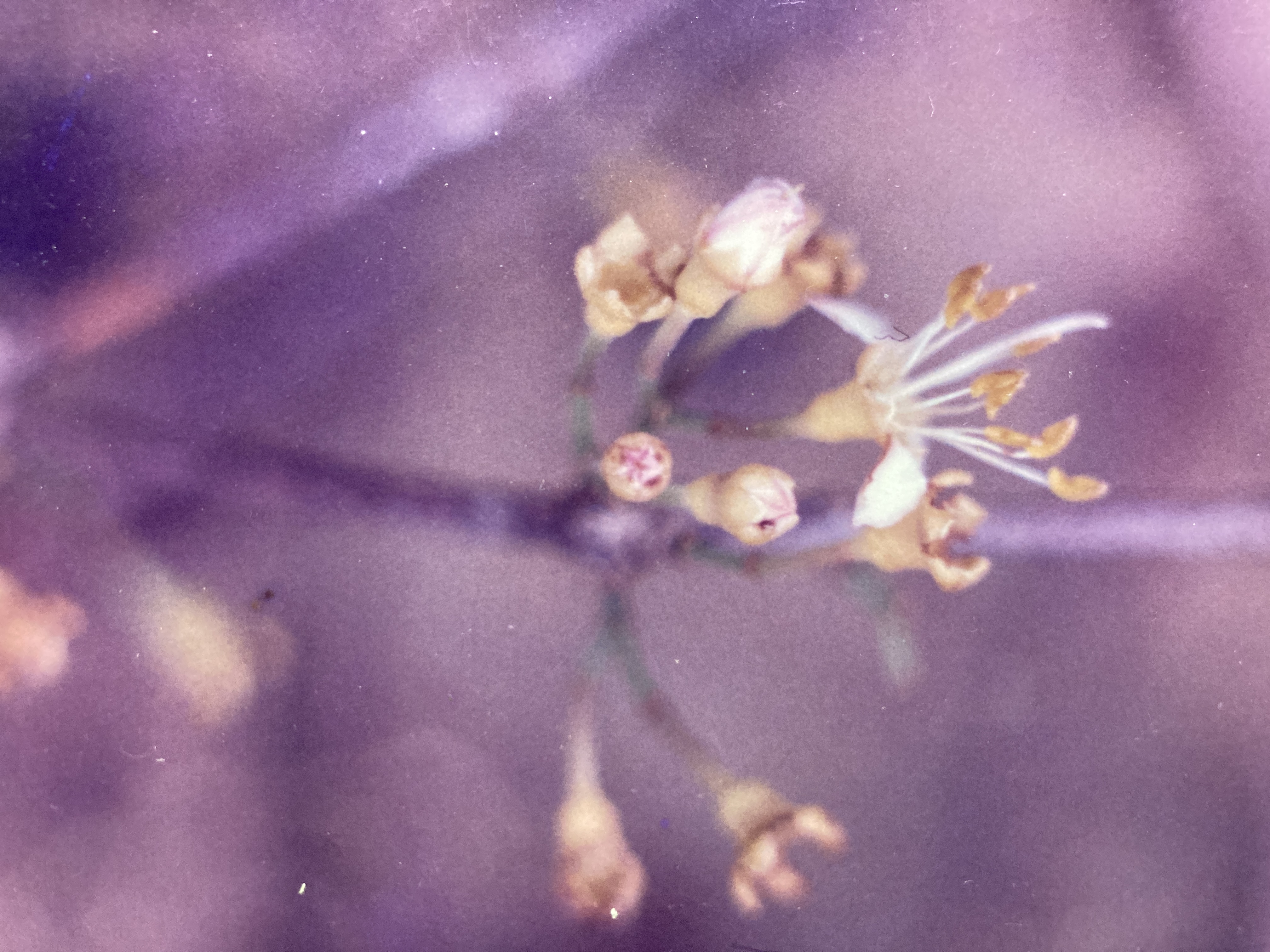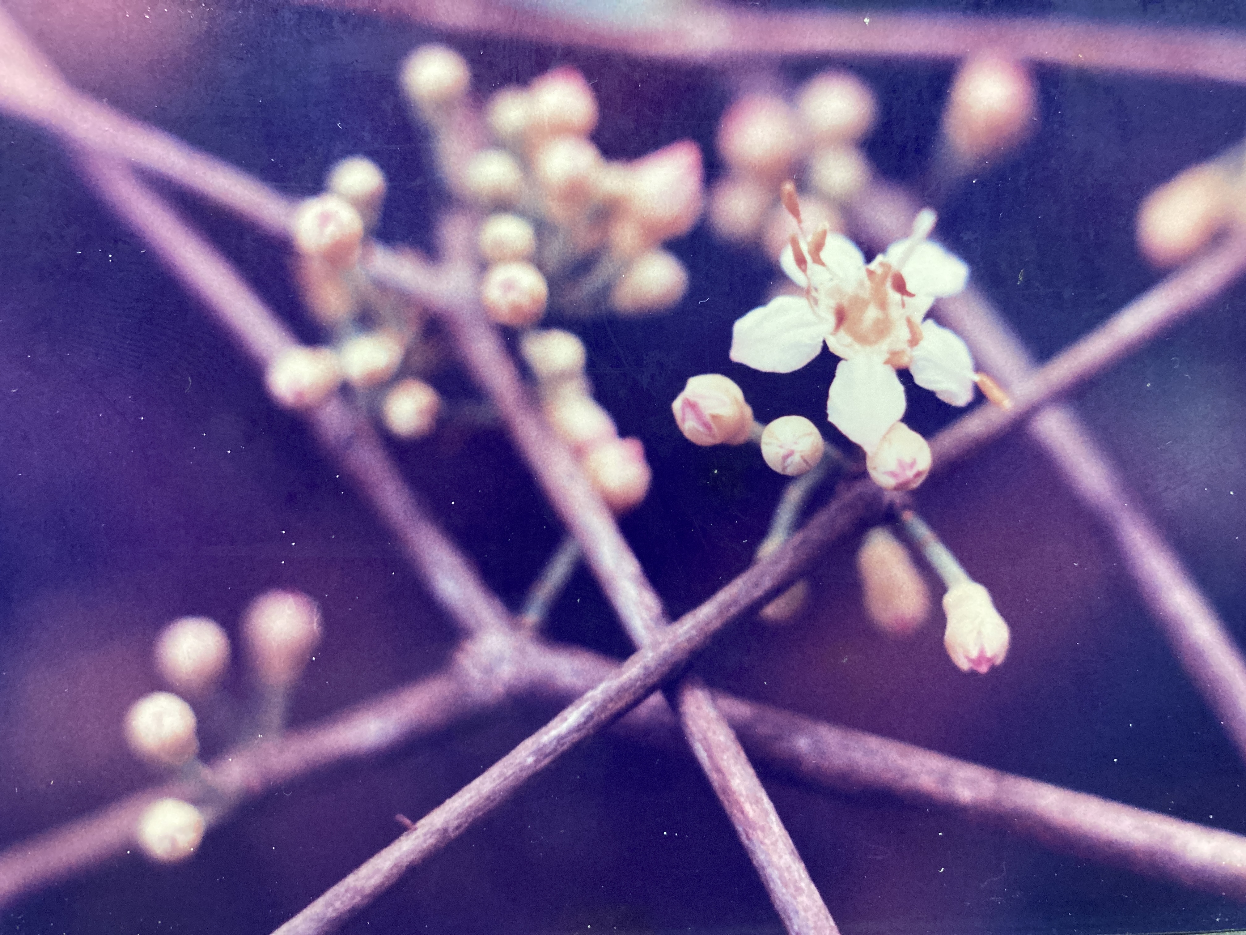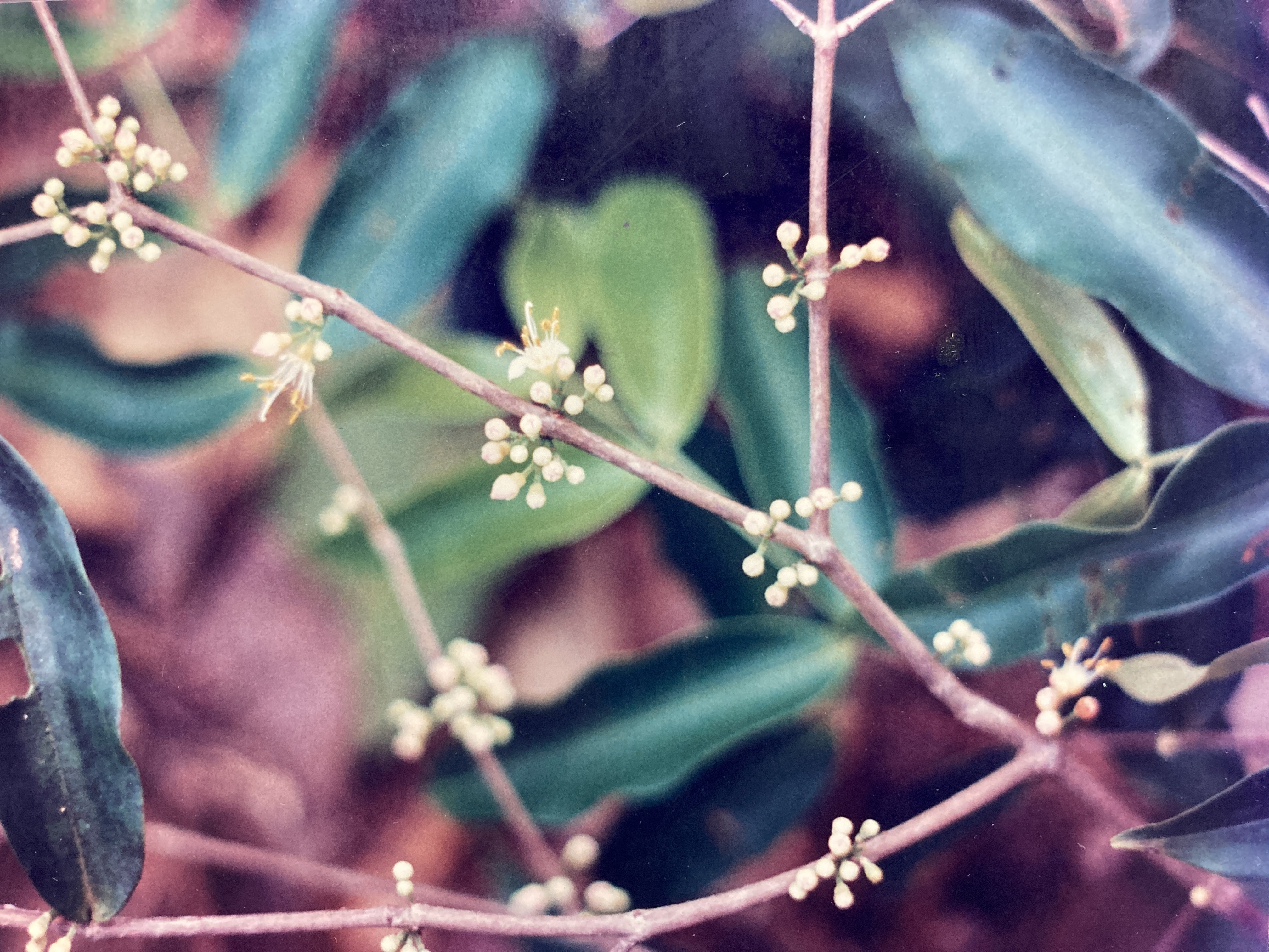 Flowers (1 cm) appear in regularly spaced clusters (of about 15 blossoms each) from the old leaf scars along the bare sections of the twigs – well behind the current foliage. A star-shaped opening at the end of each golden bud allows a glimpse of the pink-edged, white petals within. Upon opening, each flower sports five, widely separated petals; ten, long, yellow-anthered stamens; and a single, white pistil. The whole structure is supported by a deep, cup-like calyx at the end of a long (1 cm) pedestal. Mouriri flowers are delicate and their petals are detached with ease. A literal rain of white, confetti-like corolla parts often fills the air underneath these trees during the peak of the flowering season. Flowering lasts from late May to early July.