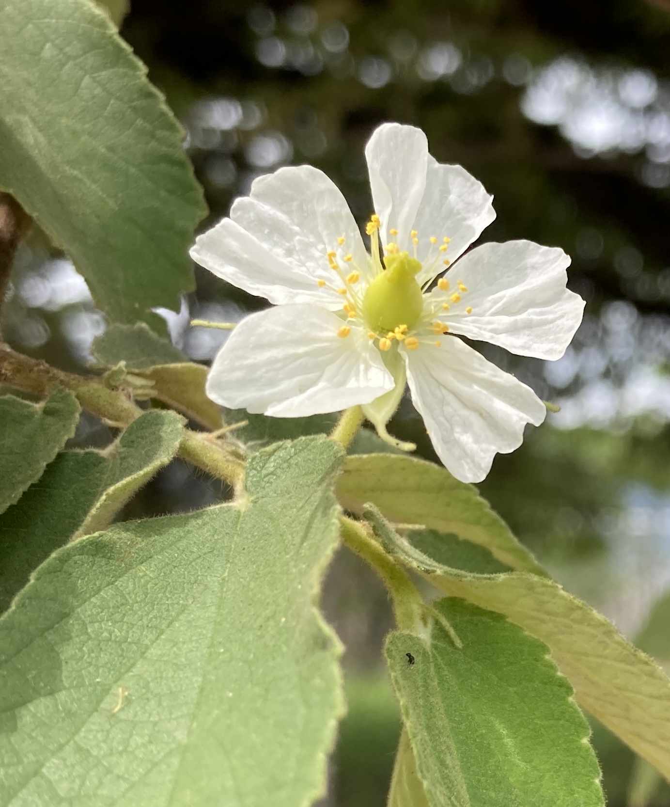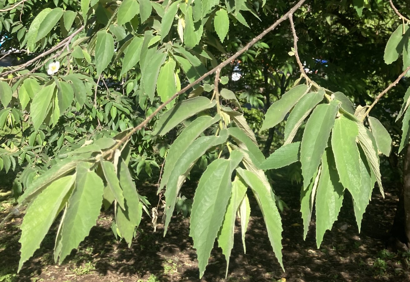 Leaves (9 x 3cm) are simple and alternately arranged. Each spear-shaped blade has serrate edges and an unequal base where it joins the short petiole. Leaves and petioles are covered by a fine pubescence.