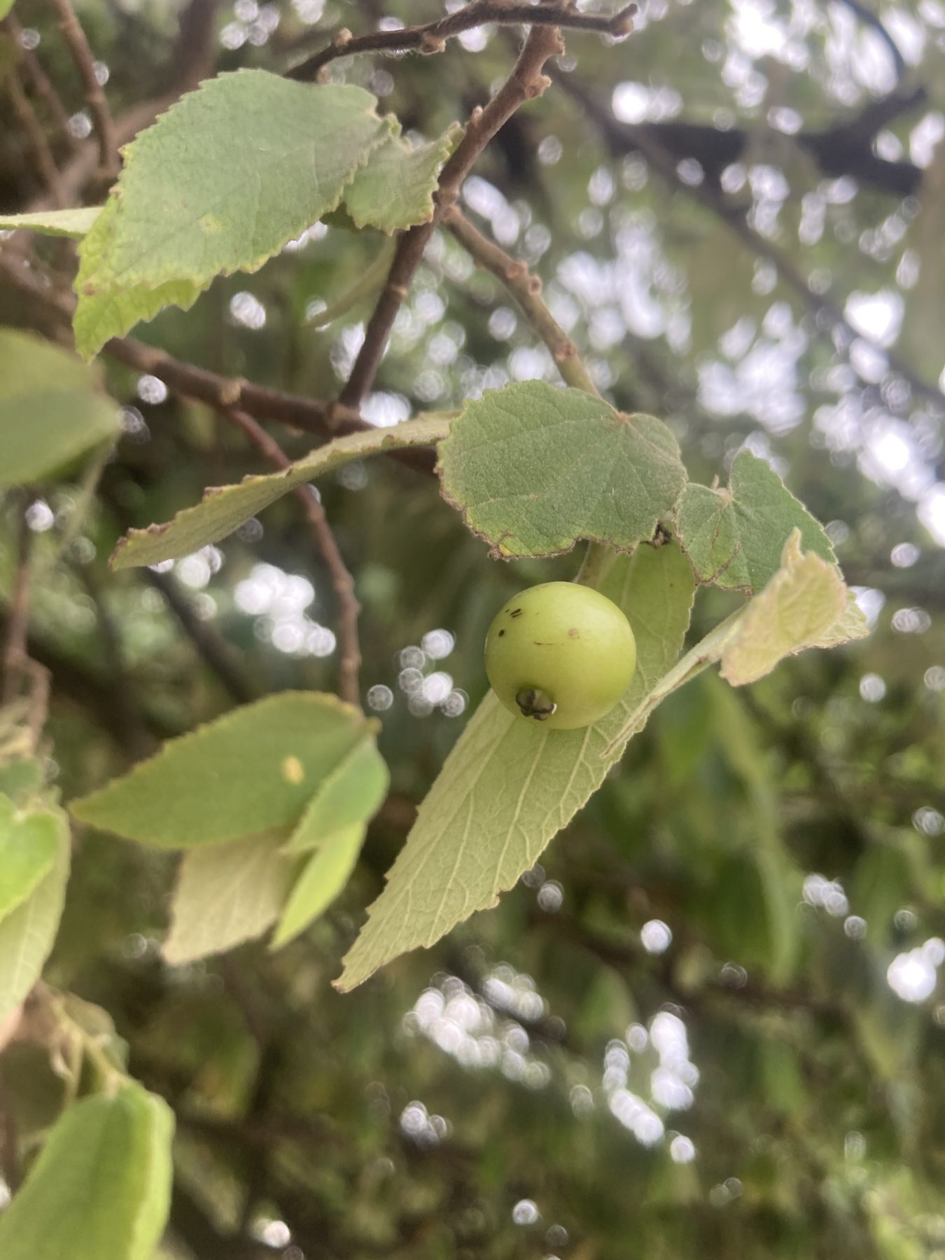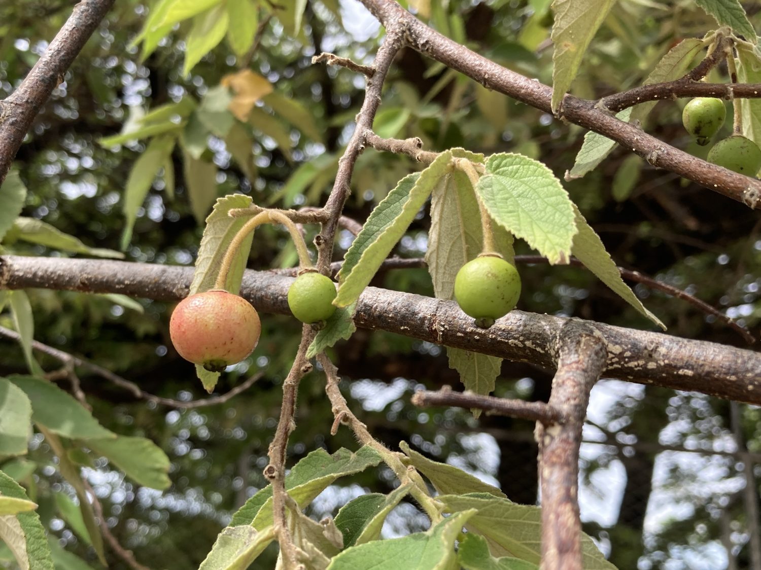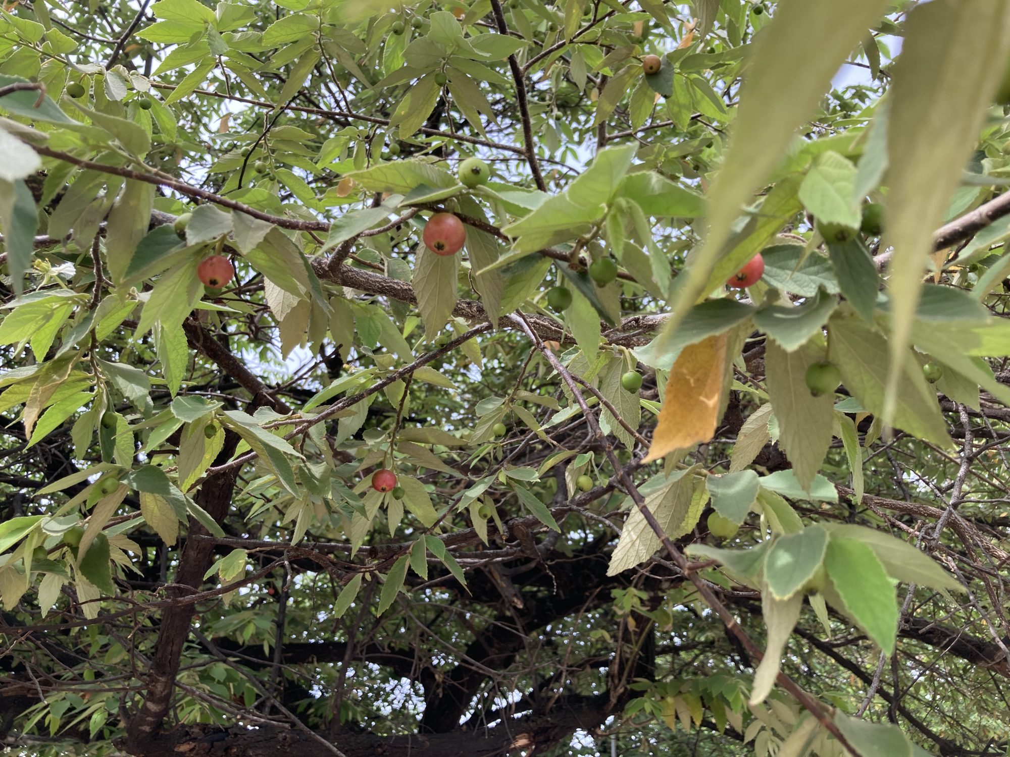 Capulín fruits (1.5cm) mature within a few weeks of flowering, turning from green to pink or red. Each is an edible, sweet, spherical berry whose flavor is unique, defying accurate description, but perhaps most similar to cinnamon. Though potentially present at all times during the year, they are perhaps most abundant during the early rainy season months of June and July. Fruits contain a myriad of minute (< 1mm), pale seeds.