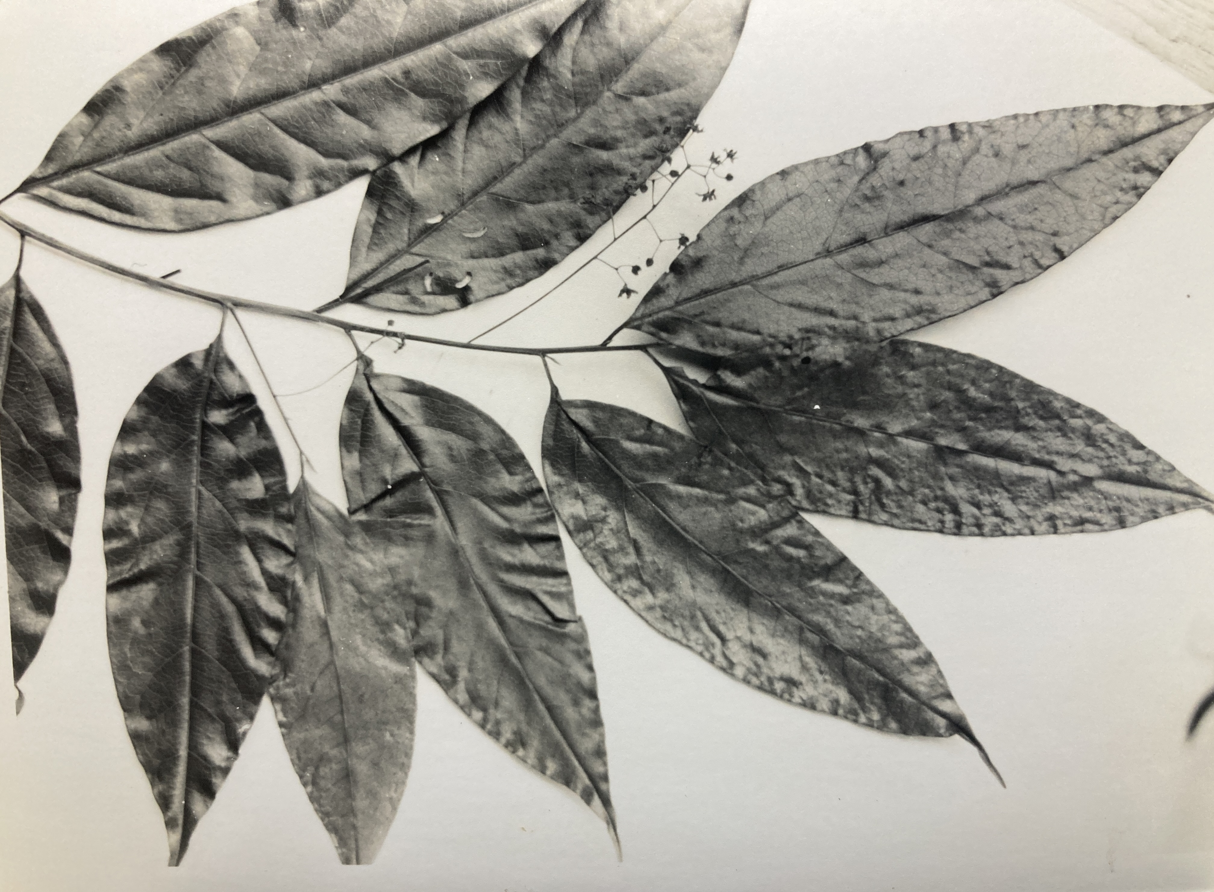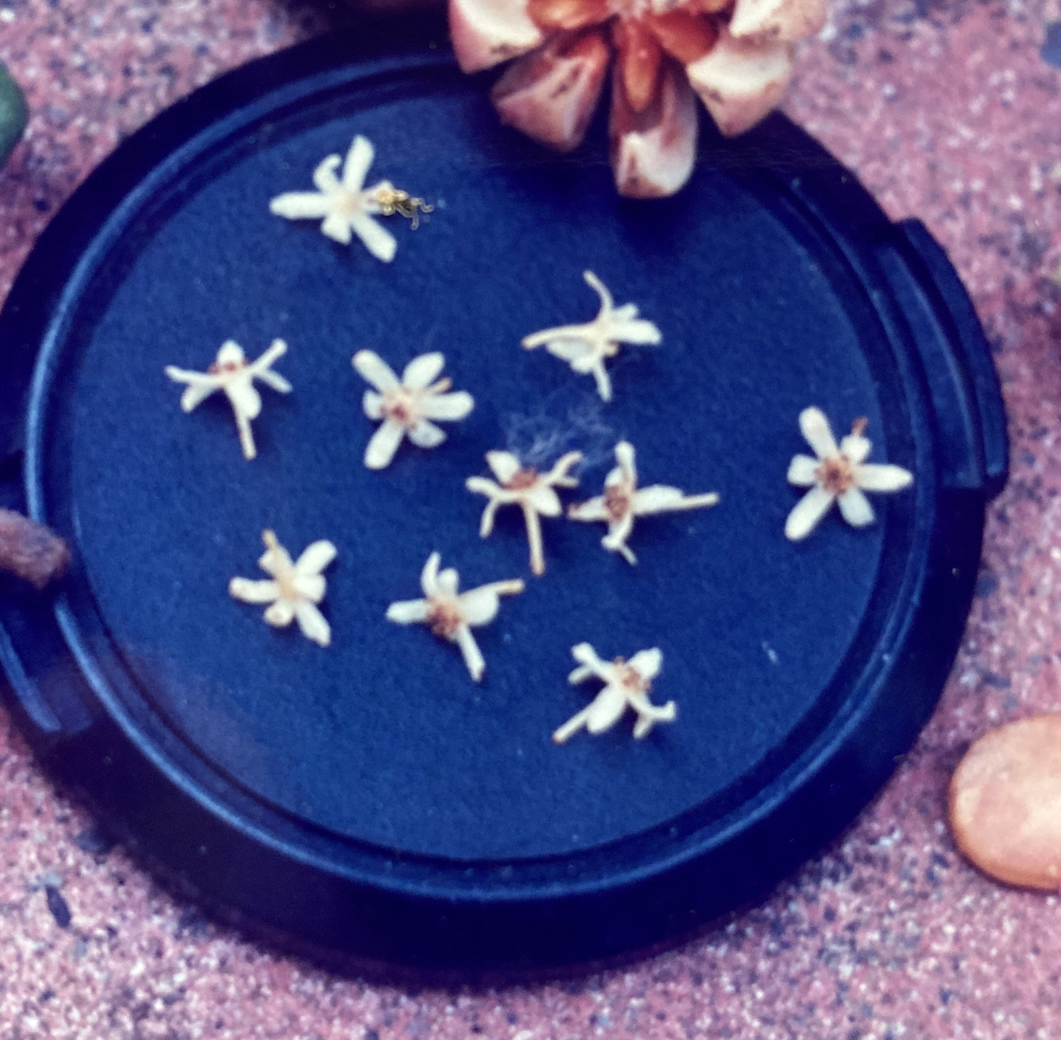 Pink-stemmed flower panicles (8 cm) emerge from the axils of the fresh foliage. Each small, white blossom (0.5 cm) presents a perianth composed of nearly identical sepals and petals. Narrow, minutely pubescent, and finger-like, the flower’s three sepals bend backwards and alternate with the three forward-bending petals. Multiple and minute – nearly invisible – stamens occupy the yellow flower center. Most trees produce flowers annually, although some seasons are skipped by isolated individuals. Blossoming can be quite prolific, with the upper crown of the trees acquiring a whitish, fuzzy, and veiled aspect during peak activity. Flowers are present from late April through May, with some sporadic fertility occurring as early as February. Fruits begin to develop immediately thereafter.