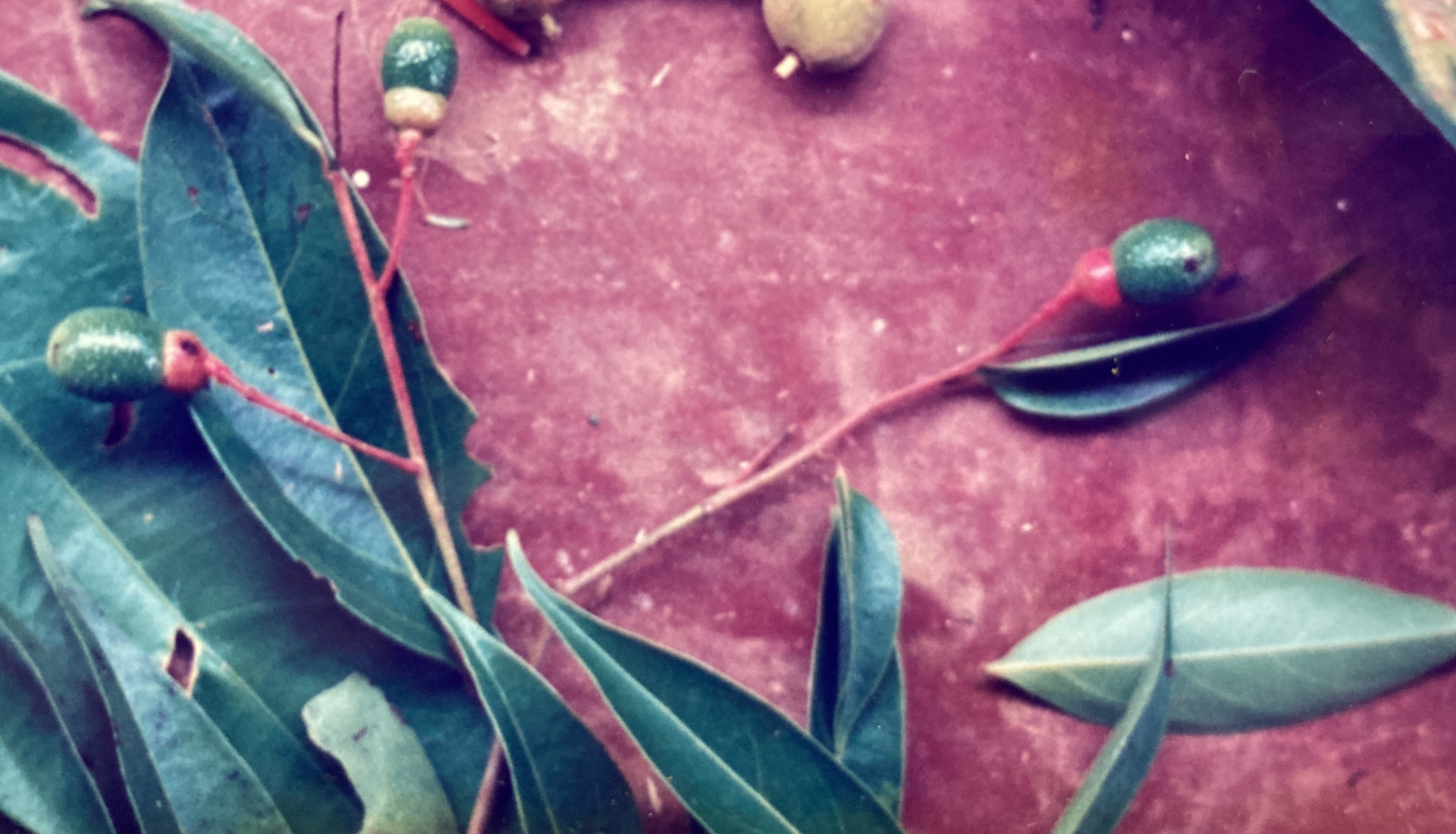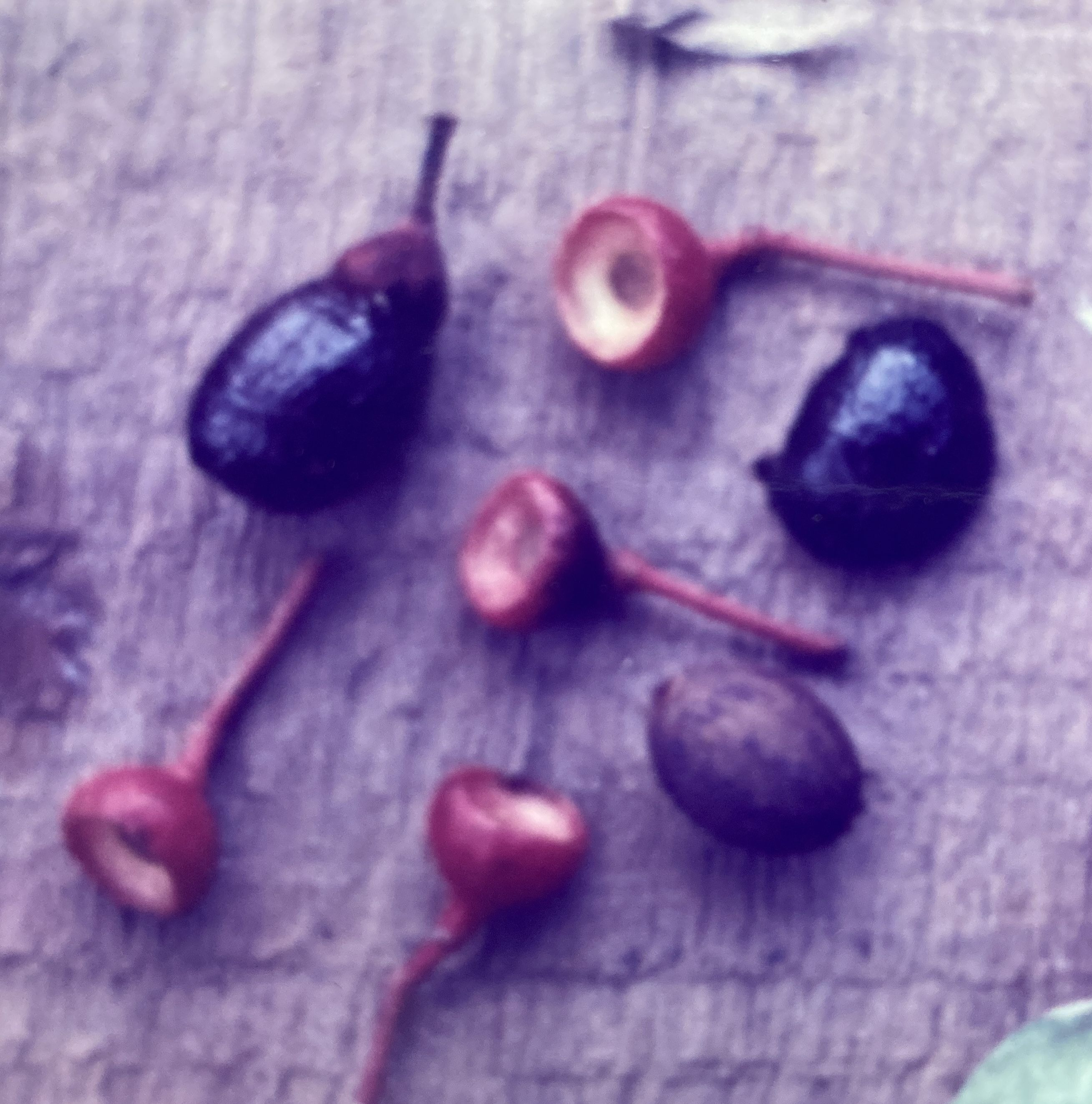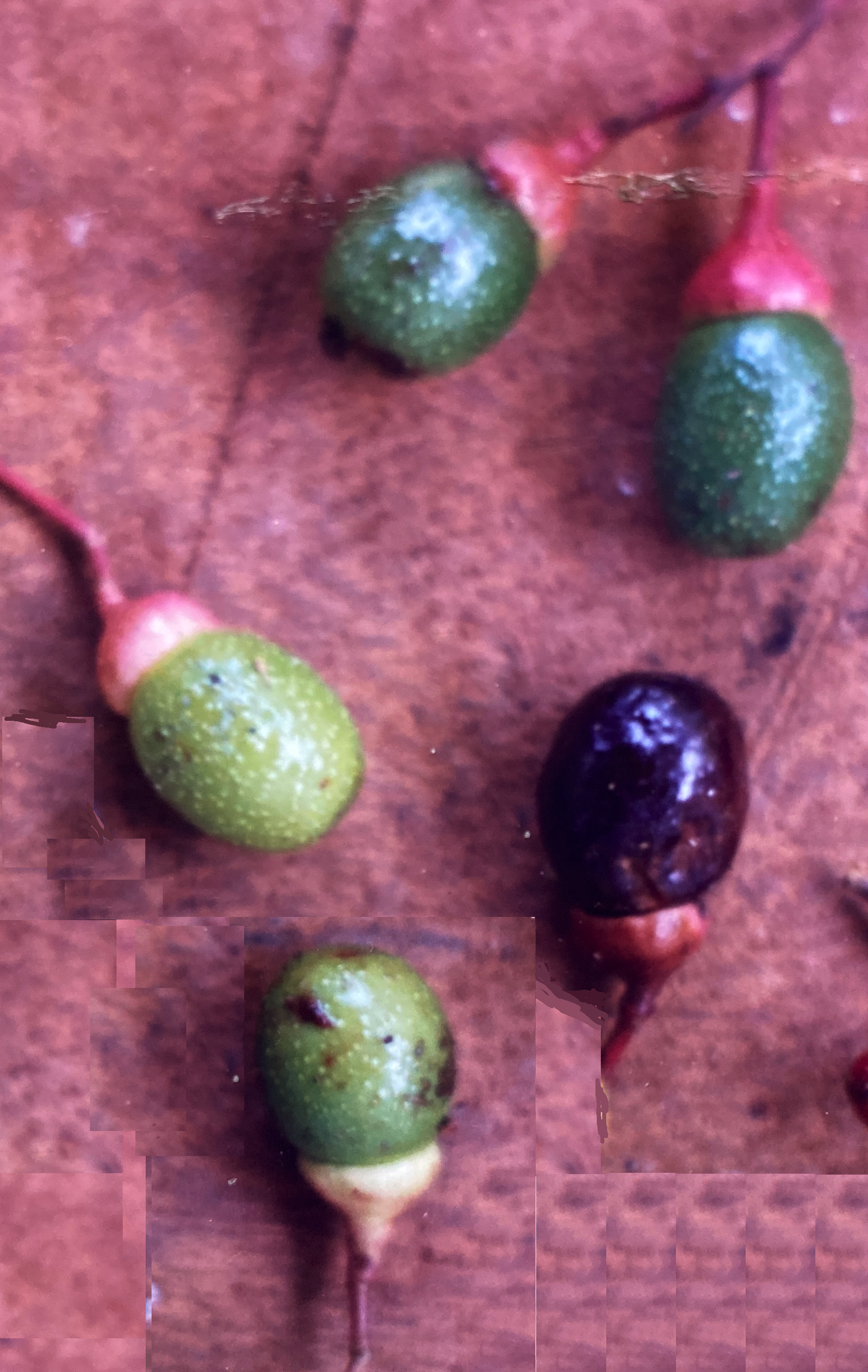 The old flower calyx swells into a large cup-shaped base that soon turns scarlet red and becomes an obvious feature in the crown. Each calyx holds an ovoid, glossy-green, white-speckled fruit (1.5-2 cm), shaped something like a small avocado. These mature into dark, black-purple drupes, each containing a single, rounded seed (1 cm) embedded in about 3 mm of soft, oily, avocado-like flesh. Spread thinly through the crown, the fruits are held amid the foliage by long, thin, and angular pedestals. Harvests are annual events, occurring from late August though October, with individual trees participating in roughly two out of every three seasons.