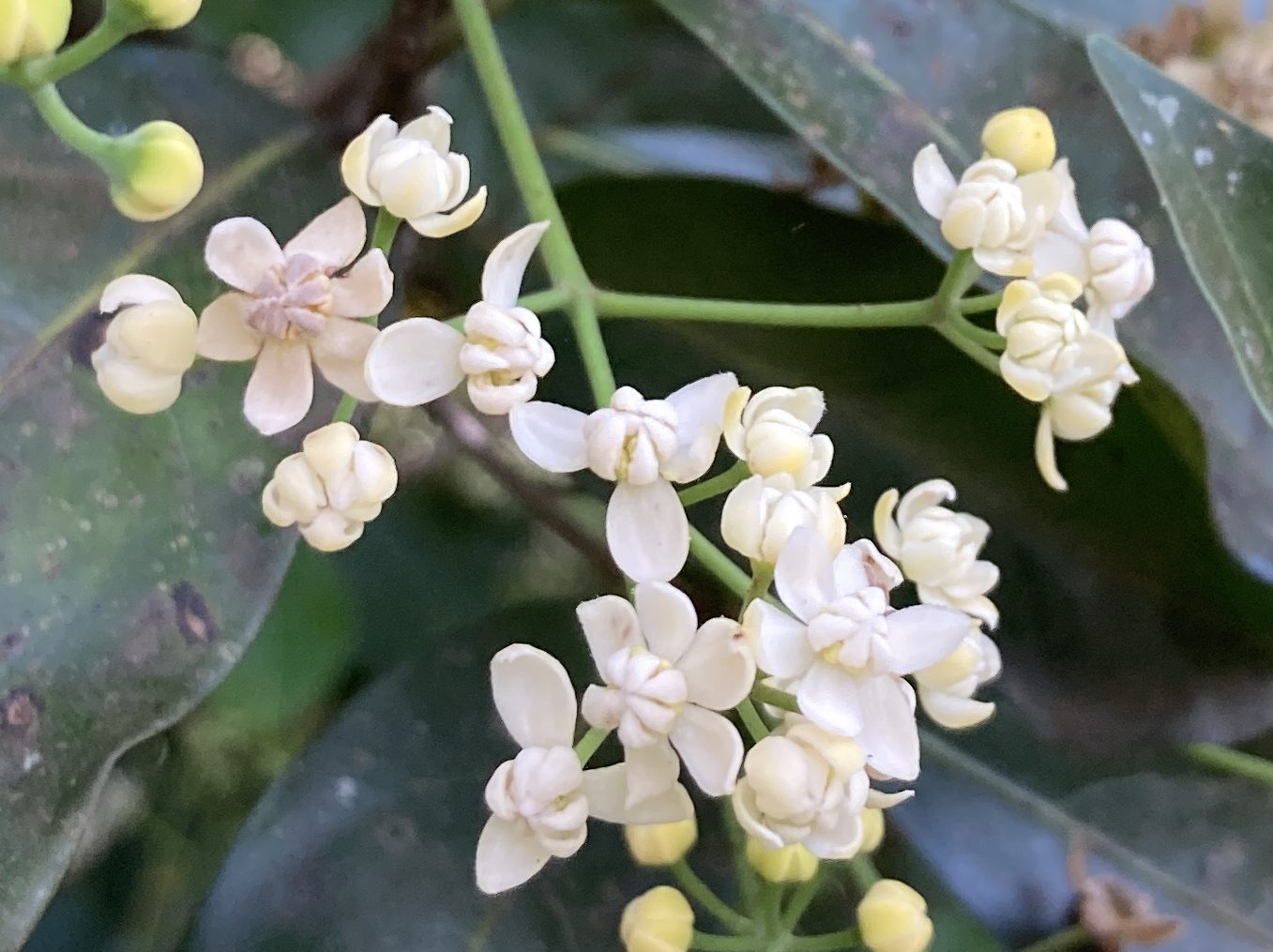 Flowers (1.5 cm) appear in small, terminal panicles of 10 or so blossoms each. They are off-white in color and composed primarily of six thick, pubescent petals. Six smaller and upright petal-like appendages cover the flowers center, where multiple, short stamens and single pistil reside. The sepals are fused into a small, cup-shaped calyx. This tree’s flowers emit a strong, pungent odor that is notable at some distance from the plant when blossoms are abundant. Ocotea is fertile on an annual basis, with most activity occurring from February through April but with sporadic flowers observable through September. Soon after fertilization, fruits begin to grow as both the ovary and calyx expand. Eventually, the calyx attains a diameter of 2 cm and a deep, bowl-like form with a raised and thickened, undulating rim.