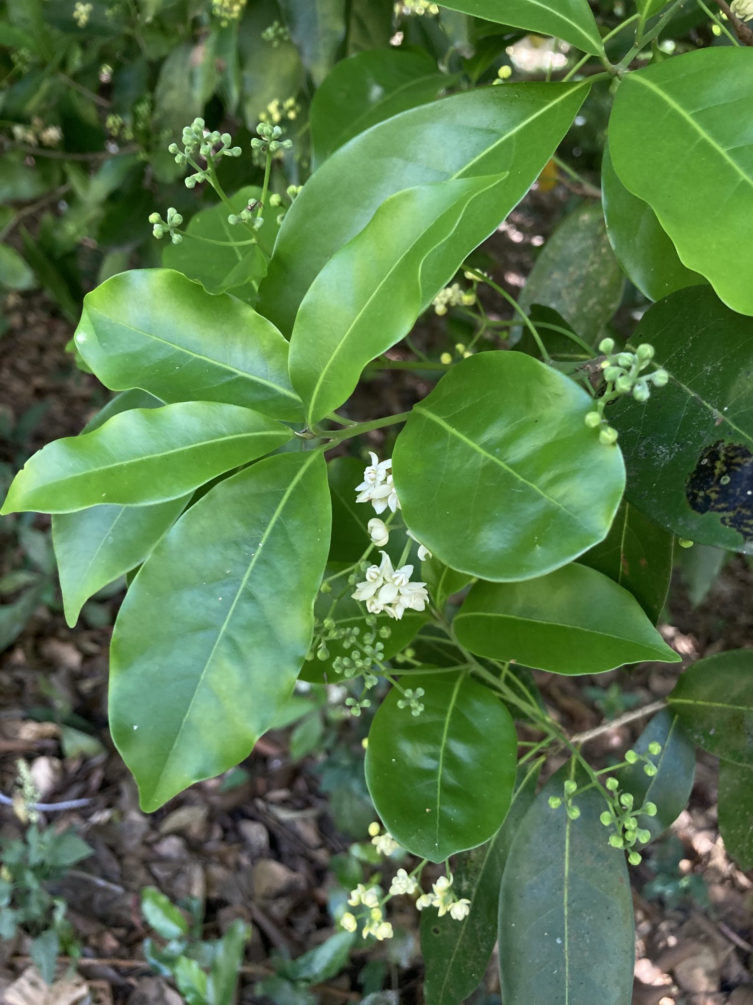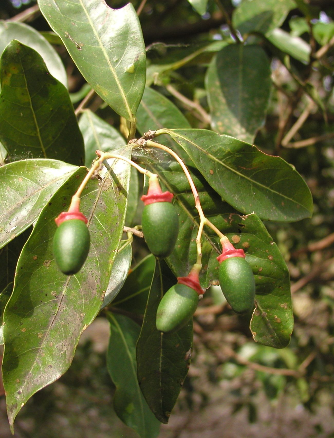 Description: Canelo has a slight, mostly cylindrical trunk (15 cm) that is usually straight but that may be found growing inclined at a significant angle from the vertical. The bark is smooth and gray. Branches occur at all levels of the small bole and they produce a narrow, elongate, and thin crown. Leaves are simple, alternate, thick and leathery. Their smooth, elliptical blades, with small drip tips (1 cm) and short petioles (0.5 cm), are variable in size, ranging from 10-17 cm in length by 4-6 cm in width. New foliage may be produced by individual plants sporadically during the year but most new growth occurs around January, just before blossoming.