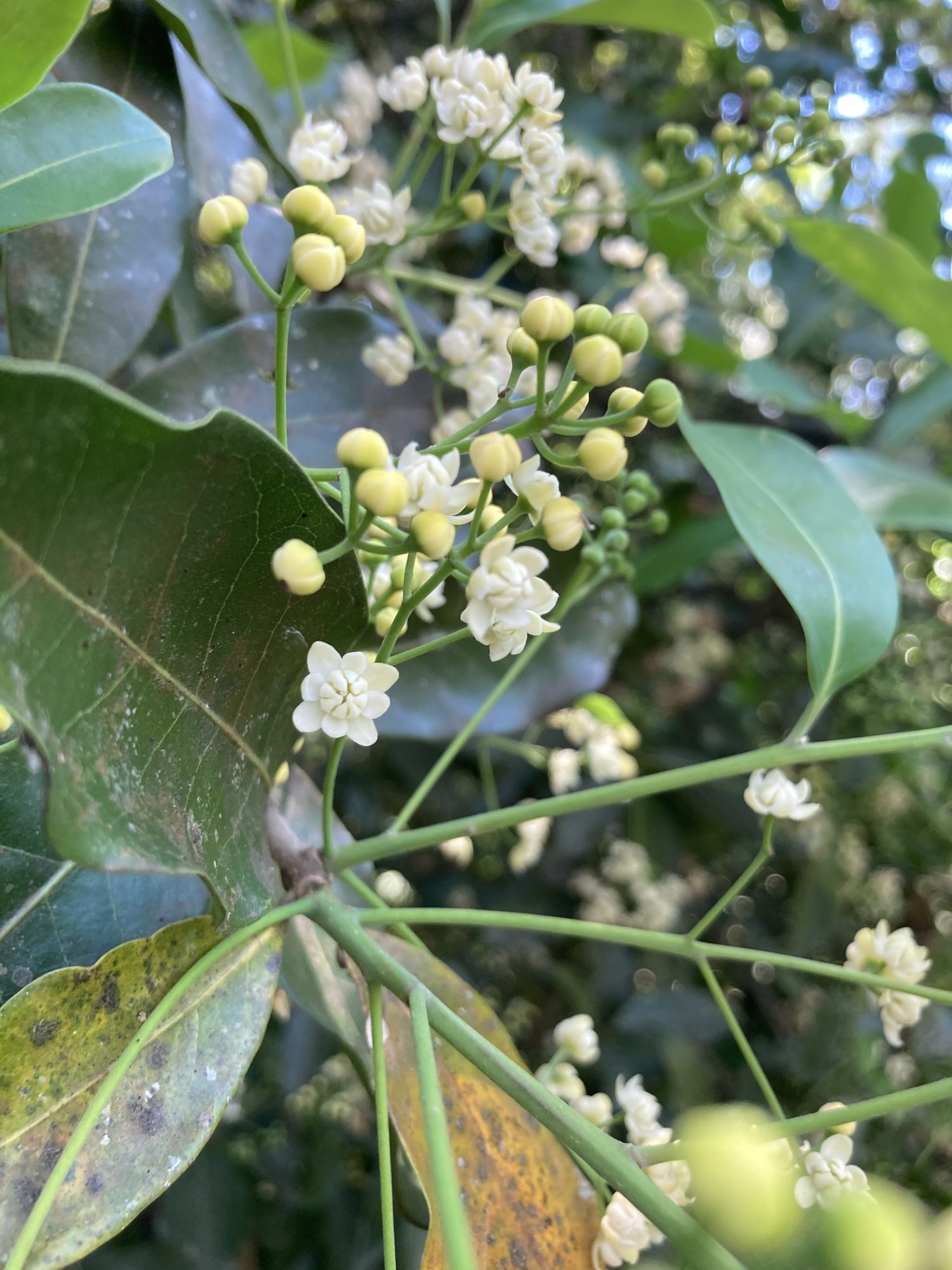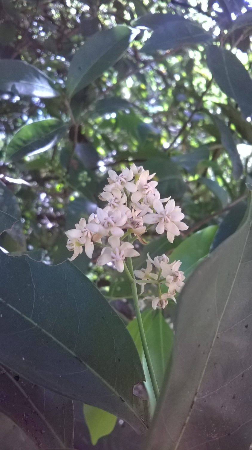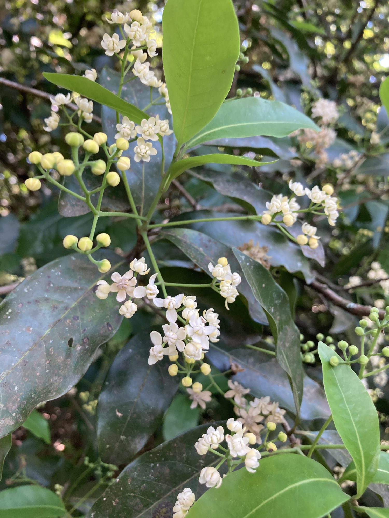 Flowers (1.5 cm) appear in small, terminal panicles of 10 or so blossoms each. They are off-white in color and composed primarily of six thick, pubescent petals. Six smaller and upright petal-like appendages cover the flowers center, where multiple, short stamens and single pistil reside. The sepals are fused into a small, cup-shaped calyx. This tree’s flowers emit a strong, pungent odor that is notable at some distance from the plant when blossoms are abundant. Ocotea is fertile on an annual basis, with most activity occurring from February through April but with sporadic flowers observable through September. Soon after fertilization, fruits begin to grow as both the ovary and calyx expand. Eventually, the calyx attains a diameter of 2 cm and a deep, bowl-like form with a raised and thickened, undulating rim.