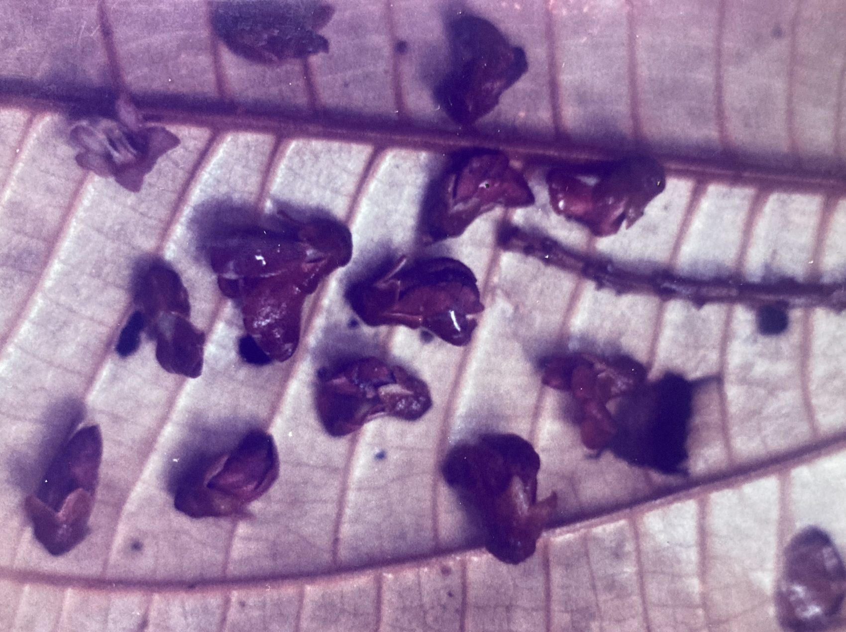 Flowers (1.5 cm long) appear in large, axillary panicles. Resembling the pea or bean flowers typical of many leguminous species, Ormosia blossoms have five unequal, maroon petals; a lobed, velvety, cup-shaped calyx; ten stamens; and a central pistil attached to a dark brown ovary. One larger petal, positioned superiorly, is wide and hoodlike, bearing a central green blotch on its surface. Inferior to it, another larger petal possesses a cup-like shape. Flowering occurs in May, but apparently only in alternate years: blossoms have been observed in 1989, 1991, 1993, and 1995.
