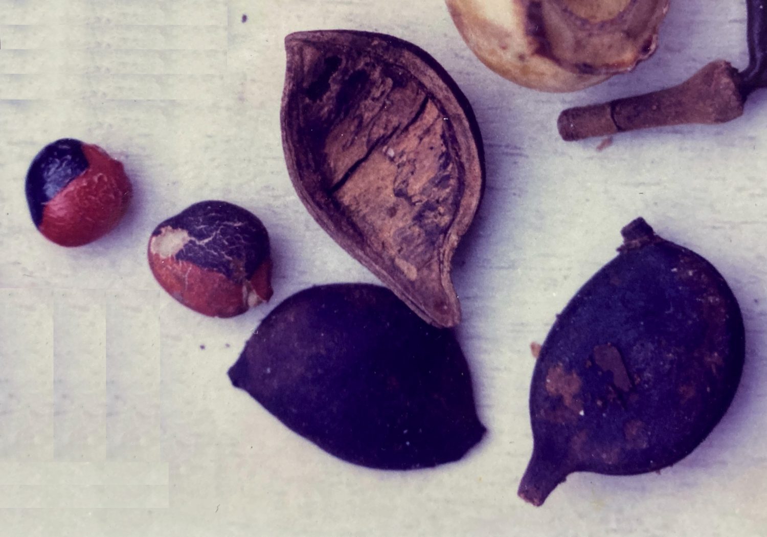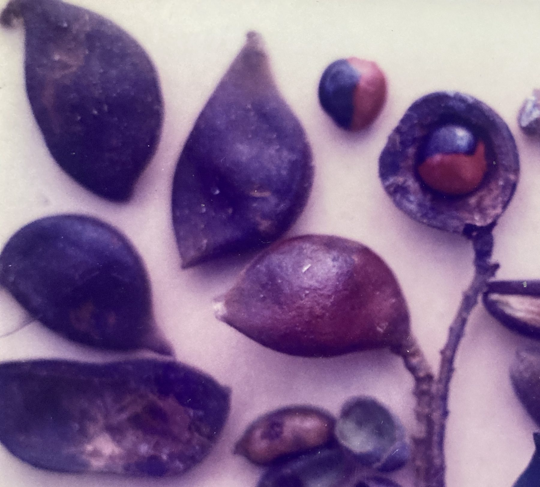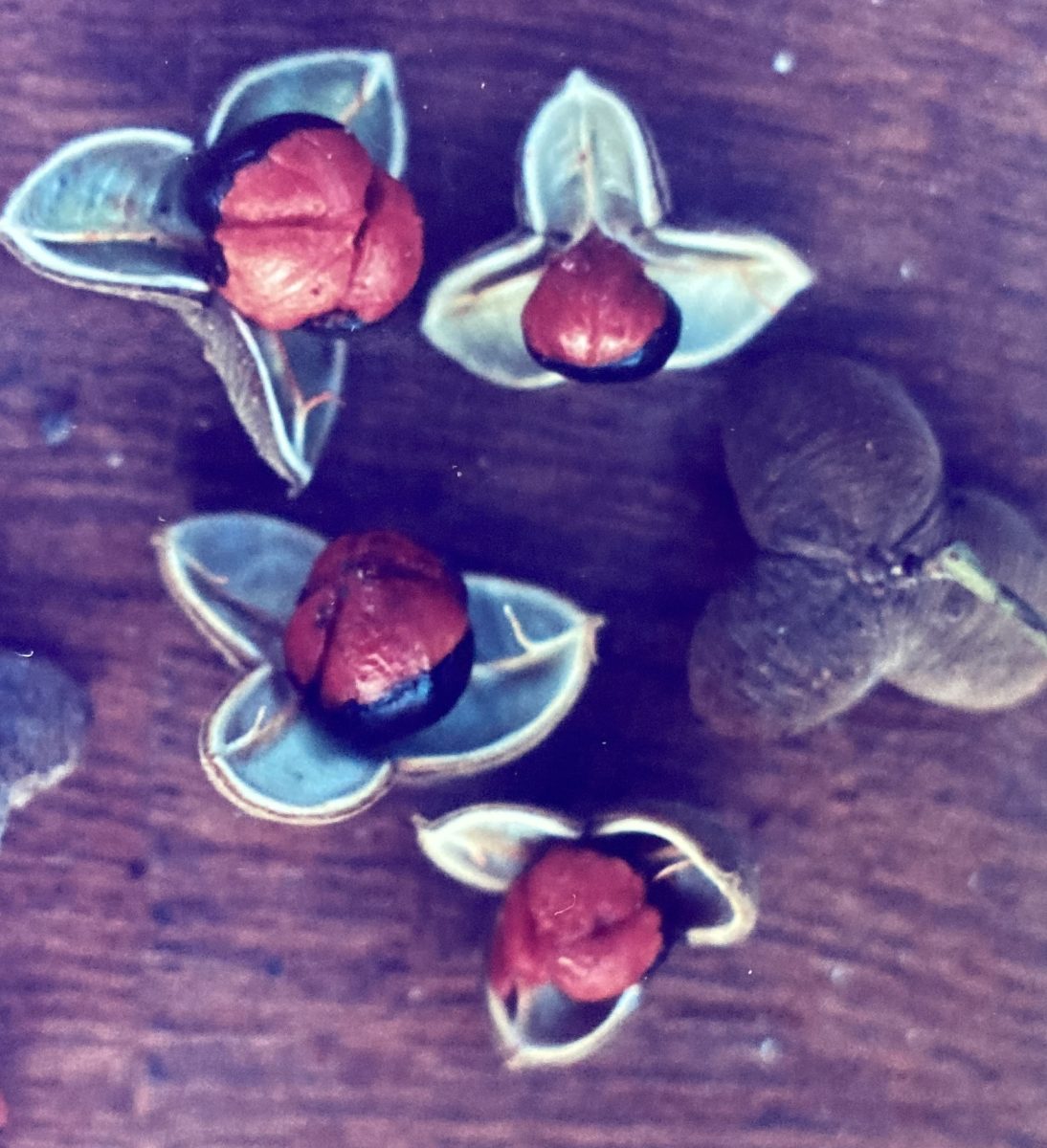 Fruits are thick-walled, somewhat flattened, woody pods (4 cm) that are held at the ends of the stiff flower-panicle stalks – well above and away from the tree crown. They are smooth-textured, glossy, and sport a reddish-brown hue when mature. Eventually, each pod splits longitudinally and exposes a single, rounded and bicolored seed (1 cm). Half brown and half orange, its distinctive coloration is unique and positively identifying. Harvests begin in September and last at least until November, during which time the pods slowly open. However, Ormosia seeds often remain in the canopy for months after this, resting in the open pods until the wind or some animal dislodges them – or until the pod rots and falls to earth. Once in the moist soil, the seed germinates immediately.