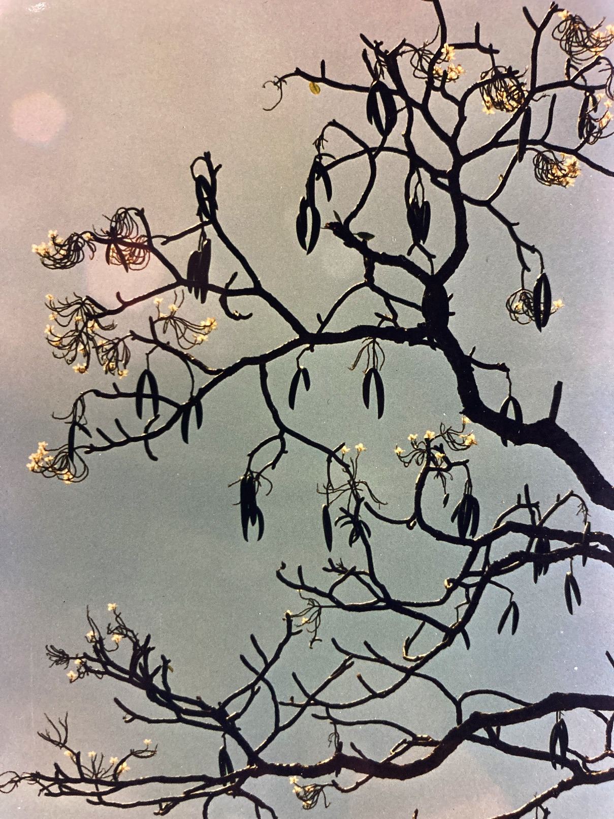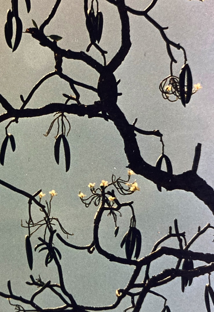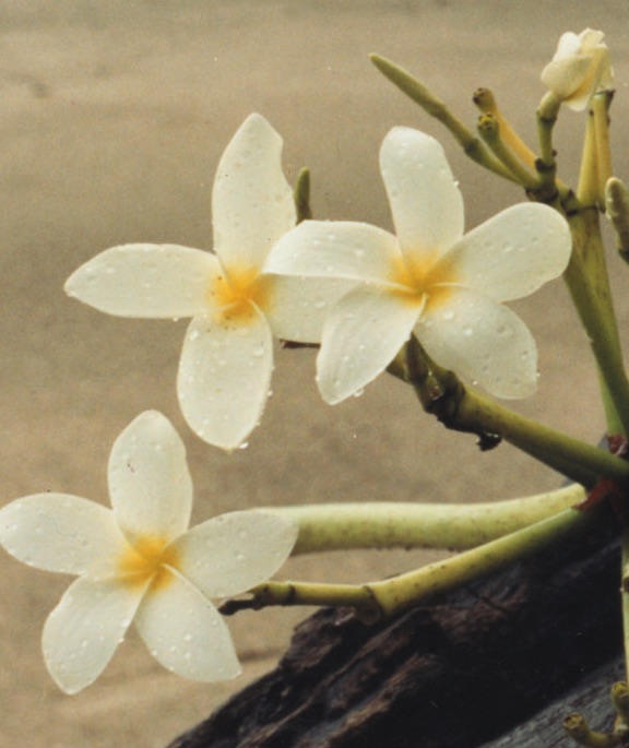 The large flowers (5cm across) appear in terminal panicles. Each blossom unfurls its 5 overlapping petals from a lance-shaped, twisted, tubular bud, revealing a crème-colored flower with a yellow center. These structures may appear at any time during the year but are most abundant during the dry months from January to April.