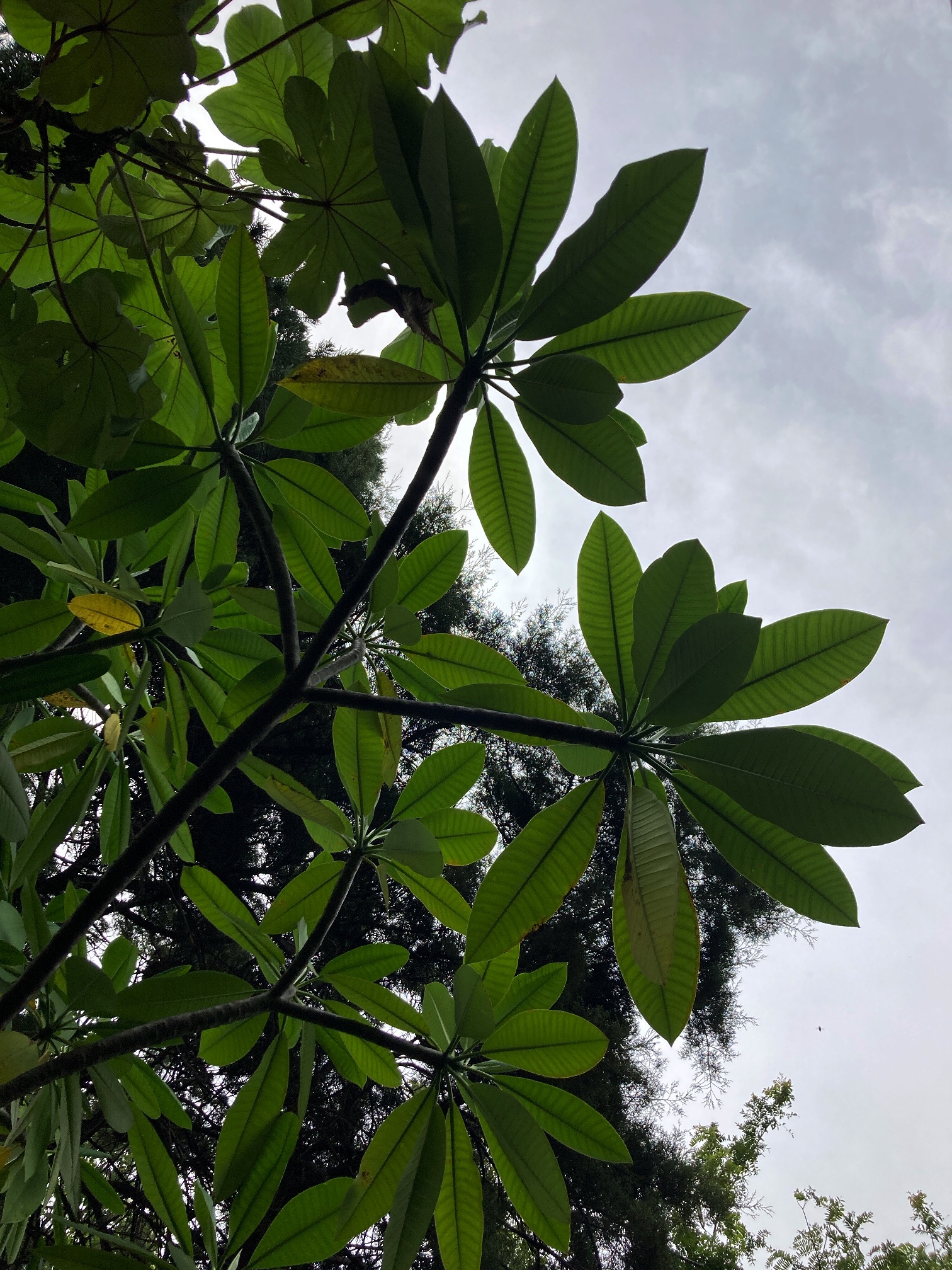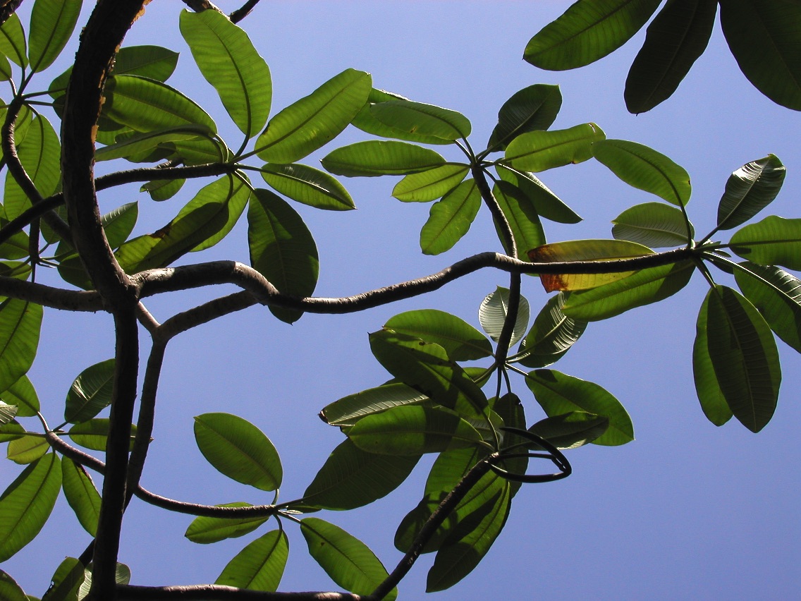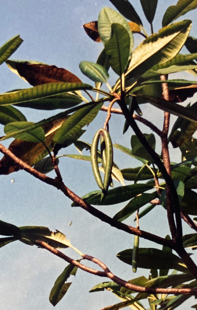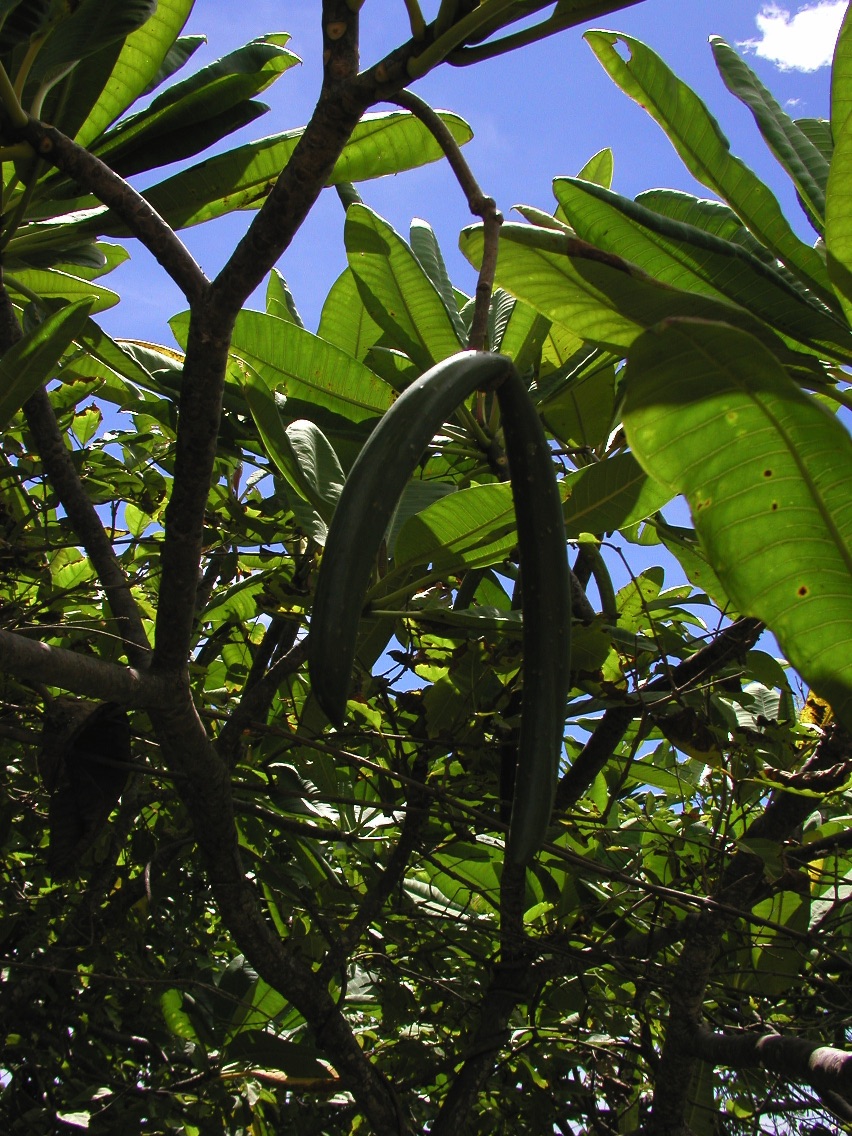 Description: Flor Blanca trees have fluted, irregular trunks (20cm) that are covered in flaky, brown-grey bark. Simple and alternate, its large, elliptical leaves (45cm x 15cm) appear clustered at the ends of thick, cylindrical twigs, while the rest of the branches remain free of foliage. As is typical of the Apocynaceae pant family, the twigs and leaves of this species exude copious quantities of thick, white sap when broken.