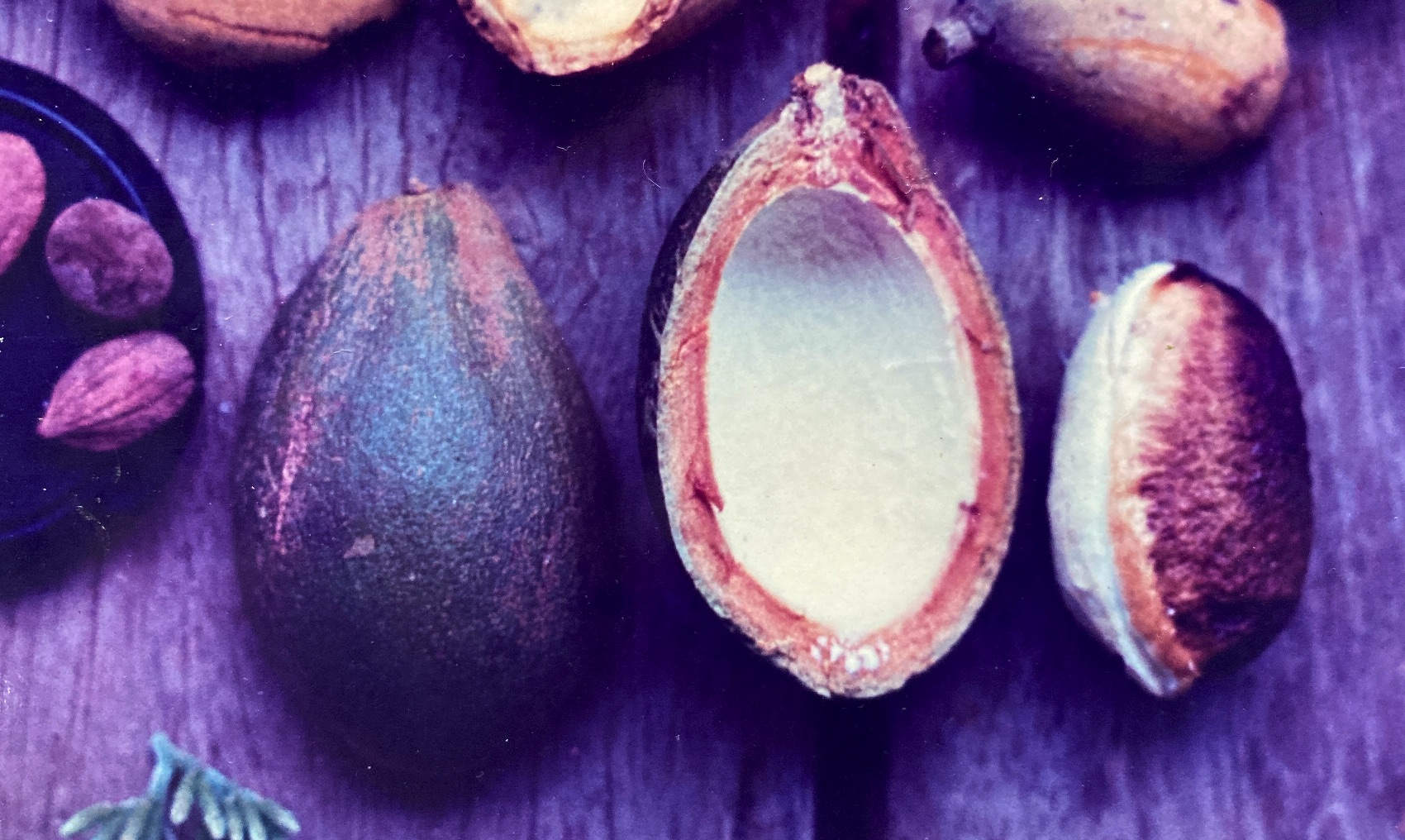 Fruits develop slowly into large (4-5 cm), sessile, ovoid berries. Golden and velvety, the thick and woody outer crust conceals a thin, edible layer of milky tissue that – although gooey – has a surprisingly sweet and fresh flavor. A single, large (3 cm), glossy-brown seed lies at the heart of the berry. Typical of the Sapotaceae, the seed’s hard testa is marked by a dull, longitudinal scar. Fruits reach full size and appear ripe by June (some six months after flowering), but tend to persist in the trees for some time after that, finally disappearing only when collected by some arboreal mammal. These extended harvests last from late May through November, with ripe, golden fruits evident in the trees during all of this time. Harvests vary significantly in size from year to year.