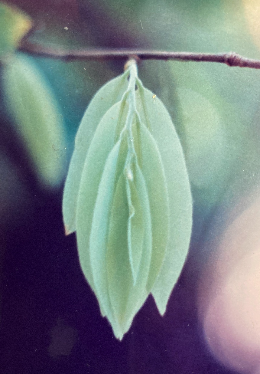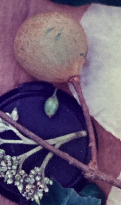 Mildly fragrant, flowers (5 mm) emerge from leaf axils in sessile clusters. Each consists of a yellowish calyx made up of five, scale-like sepals; a pale green corolla tube that is divided distally into five short lobes; five stamens inside of, and attached to, the corolla; and a short, fat, central pistil. Before the flower opens, the pistil may be observed protruding from the spherical, scaly bud, ready to receive pollen from another flower’s mature anthers in an effort to avoid self-pollination. Nispero trees flower annually, however the timing of this event varies from season to season. Synchronization among fertile trees is also quite poor. Generally speaking, flowering in this species appears to be a haphazard process that occurs for one or two, two-week periods, sometime between November and February.