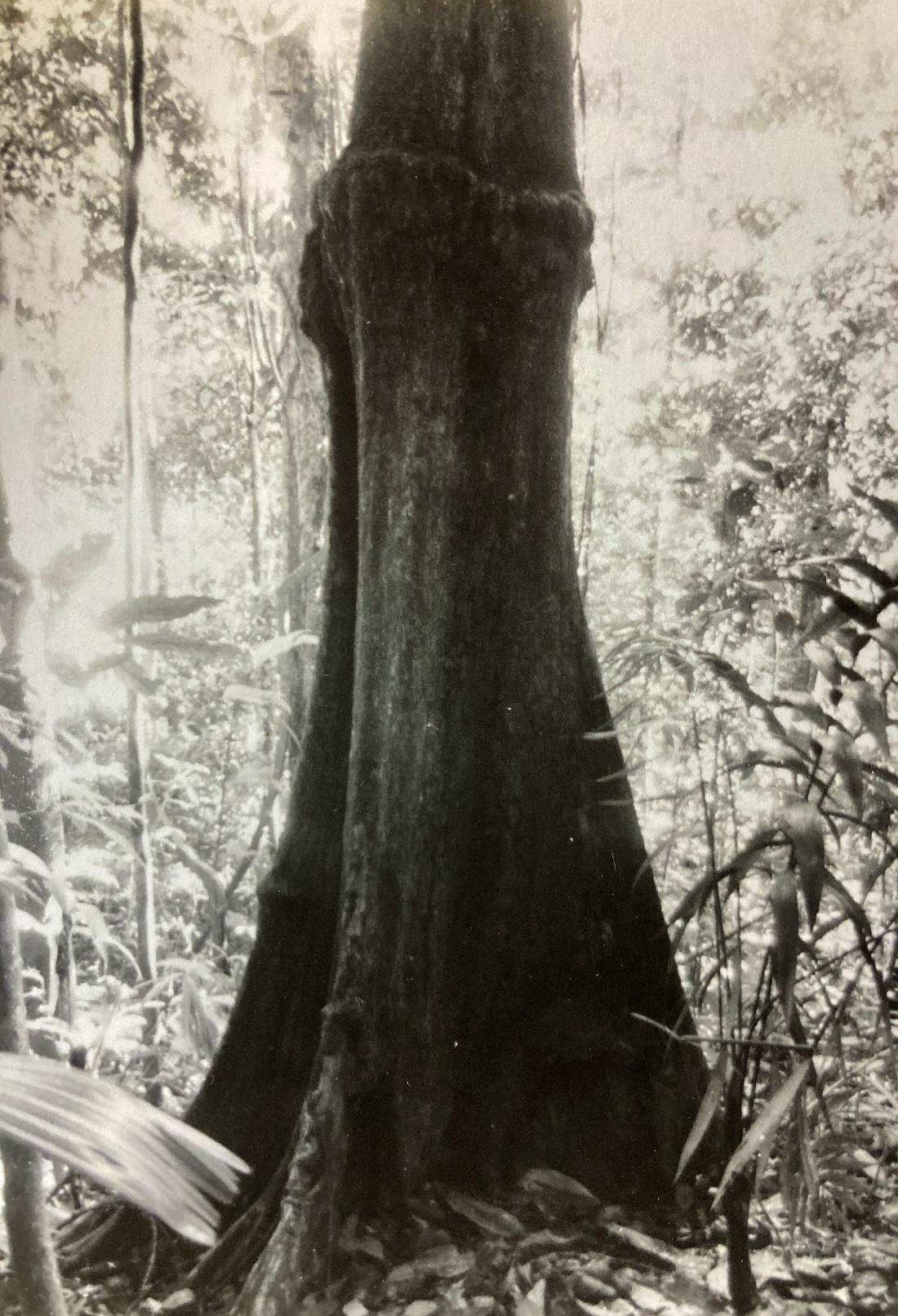 Description: P. glomerata is a tree of small to moderate size, with a trunk that usually does not exceed 50 cm in diameter. The base of this very irregular, bending, and somewhat fluted bole is flanked by tall and steep buttress roots. Often, the trunk sports a characteristic, node-like swelling several meters above the ground. The brown, thin bark is textured with fine vertical cracks and it exudes thick, white latex sap when injured – as do the twigs and leaves. Branching occurs along the upper half of the bole and these long, flexible limbs form a moderately dense, rounded canopy of a single layer. The large leaves (33 cm by 8 cm) are simple, alternate, smooth, and entire. Clustered around the tips of the thick twigs (the rest of the branches are bare), they appear to be arranged in whorls. Blades are narrowly elliptical in shape and slowly taper to points at both ends. Their extremes are marked by well developed drip tips and long petioles (2 cm). As viewed from the ground beneath them, the leaves are darkly ribbed by prominent, pinnately-patterned veins. Tufts of new foliage emerge from the ends of the branches in November and December, as 30-50% of the pre-existing leaf cover is replaced.