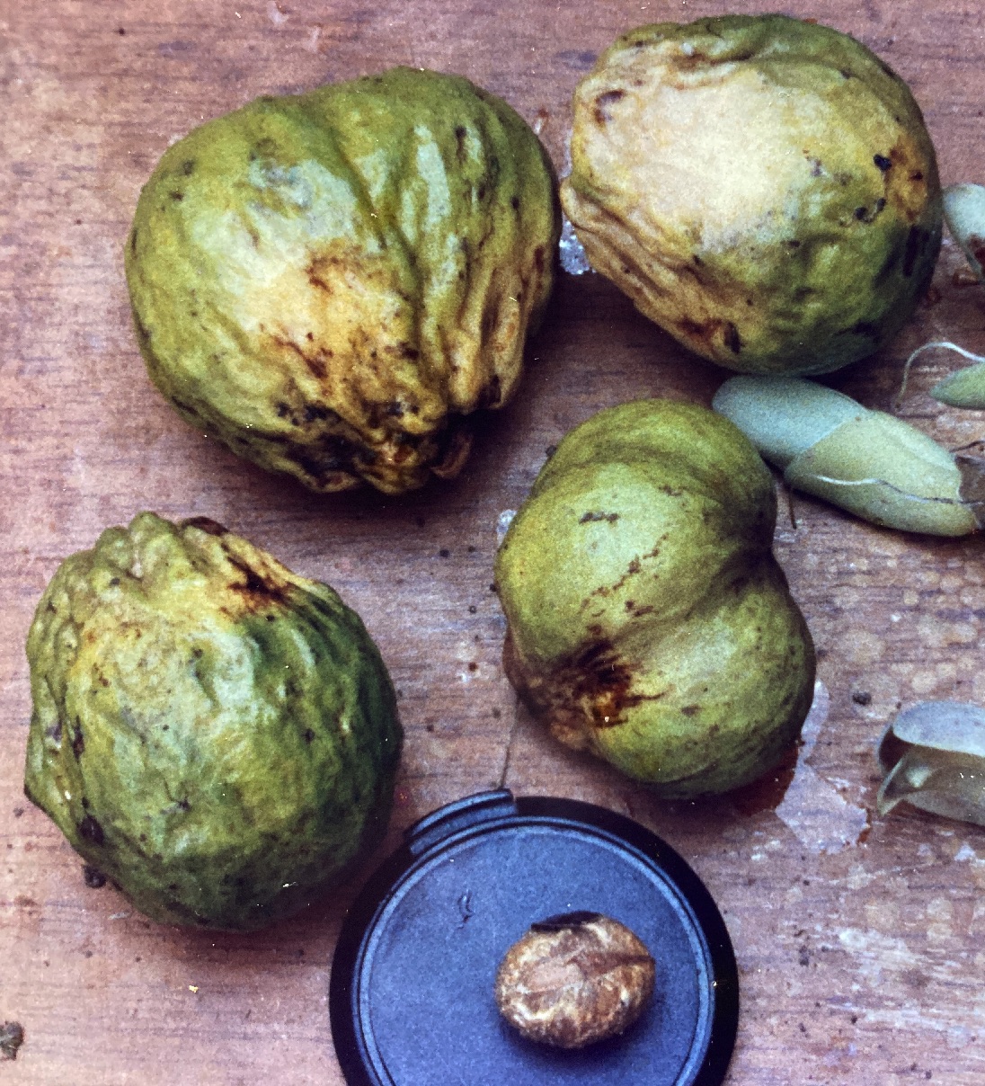 Finally, in May, fruits begin to develop as small, branch-hugging nodules. Slow growth then continues through September, at which time the pale-green, rounded, and sessile structures appear more like burls or fungal infections than actual fruits. Varying in size – depending upon whether they house one, two or three seeds – they range from 3.5 to 6 cm in diameter. When mature, single-seeded fruits are shaped and colored like Brussels sprouts. Mottled yellow and green, they are glossy and hemispherical distally but narrower and wrinkled (or puckered) next to the branch. Multiple fruits resemble two or three of the former fused together. Their thick, outer rind is woody and it covers an ovoid, longitudinally scared seed (2.5 cm). The annual harvests are consistently timed, though relatively small in size, and occur as the green fruits become partially yellow in October and early November.
