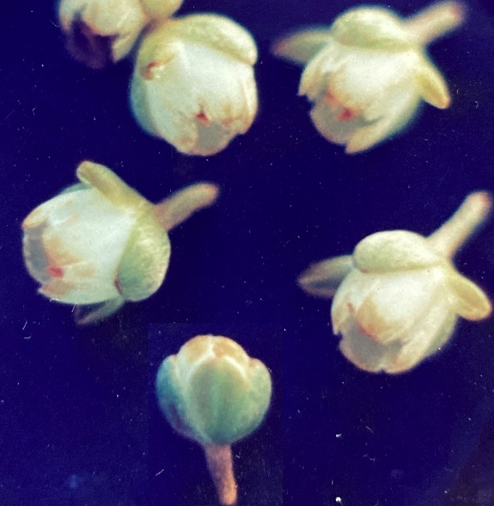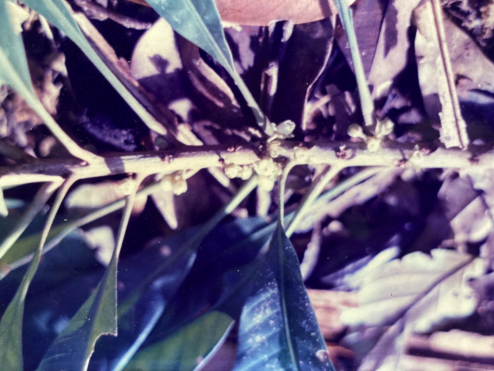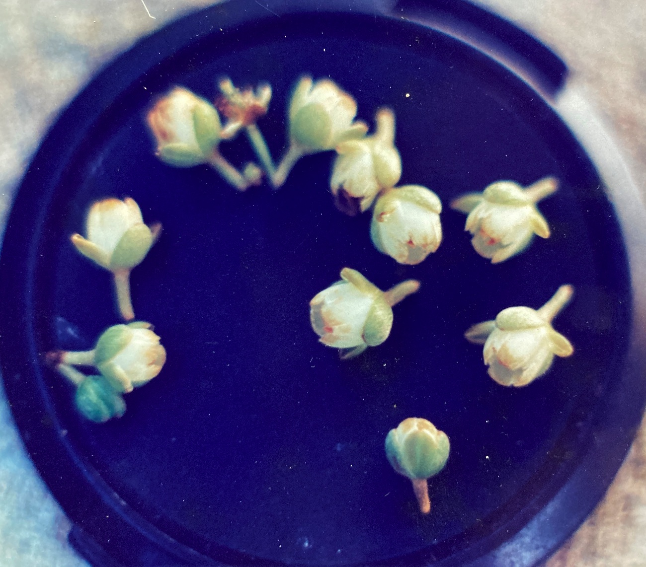 Flowers grow in small clusters from leaf axils – mostly along the bare sections of the branches behind the current foliage. Blossoms are usually so abundant that they completely sheath the limbs in white. Each flower (5 mm) possesses a green calyx made of four, scale-like sepals perched on a 3 mm pedestal; a white corolla formed from four fused petals; four short stamens attached to, and inside the corolla; and a single, central pistil. Browned and dry, spent flowers persist on tree limbs for several months. P. glomerata‘s annual flowering period is often characterized by a series of punctuated bursts of activity that occur mainly in January and February (though sometimes beginning as early as December). For three months following the disappearance of the last flowers, the fertility cycle seems to stall.