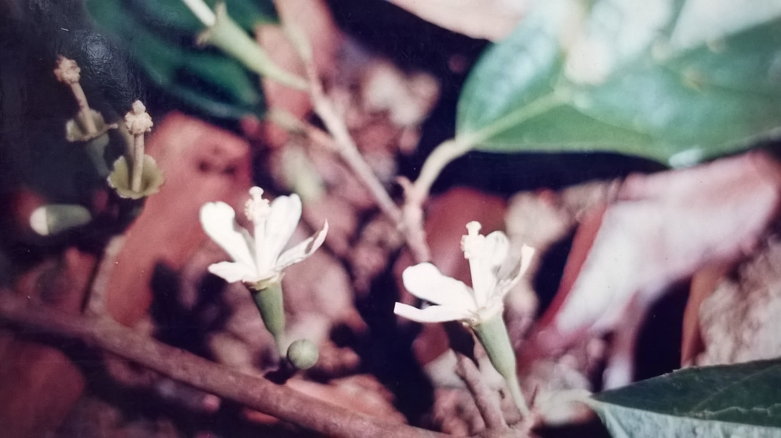 Molenillo flowers (3 cm by 2 cm) are produced singly or in small axillar clusters of up to five blossoms each. They appear close to the branch, within the doubly ranked rows of leaves, forming a marked white stripe amid the green foliage. In each flower, a green, cup-shaped calyx holds five long, narrow, fleshy, and creme-colored petals. In the center, a hollow, stalked staminate ball surrounds a slightly longer pistil that rises within it. Blossoms smell strongly and sweetly of honeysuckle and during intense flowering periods they fill the forest air with their agreeable odor. The main flowering season begins in late May, peaks in June, and lasts through July. It is moderately well synchronized, with trees in a single stand flowering in unison but with stands separated by several kilometers staggered by as many as two or three weeks in their fertility cycles. Sporadic incidents of flowering have also been observed in October, December, January, and March.