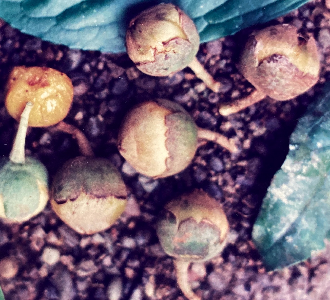Fruits begin growth immediately, emerging from the widening calyxes and reaching a diameter of 3 cm. Green and globular but with pointed tips, they contain a moist, yellow, fibrous material surrounding two nearly hemispherical white seeds (1 cm). Particularly large fruit crops occur in two-year cycles, with intervening years witnessing smaller harvests. Activity can be very intense, causing many fruits to fall and accumulate on the forest floor until it is nearly covered. Eventually they rot, becoming infested with white fungus and maggots, and filling the heavy, humid jungle air with an acrid, musty smell. Fruiting occurs from mid-July through October, with individual stands participating during only a part of this extended period. Seeds germinate within a month of reaching the damp forest floor.
