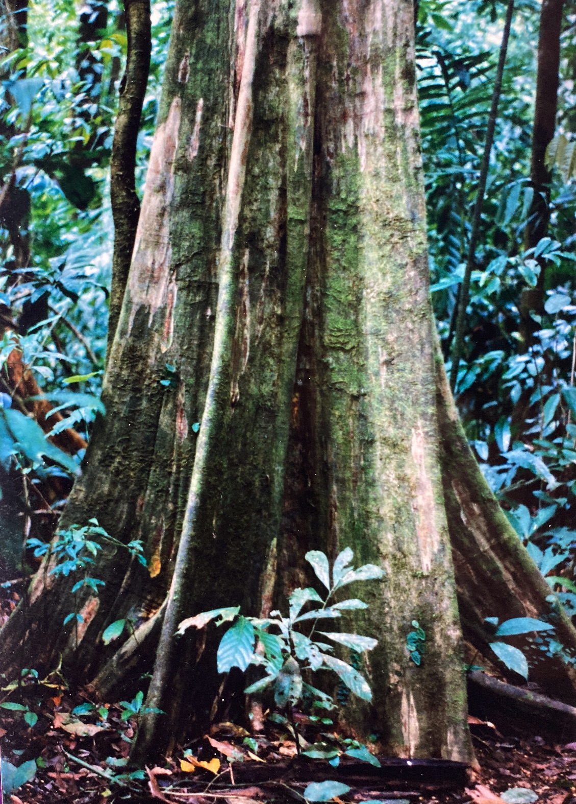 The extraordinarily thin and flat buttresses have often been sawed off of standing forest trees for use as shelves or tables. Many living individuals still bear the scars where such planks were cut from them.