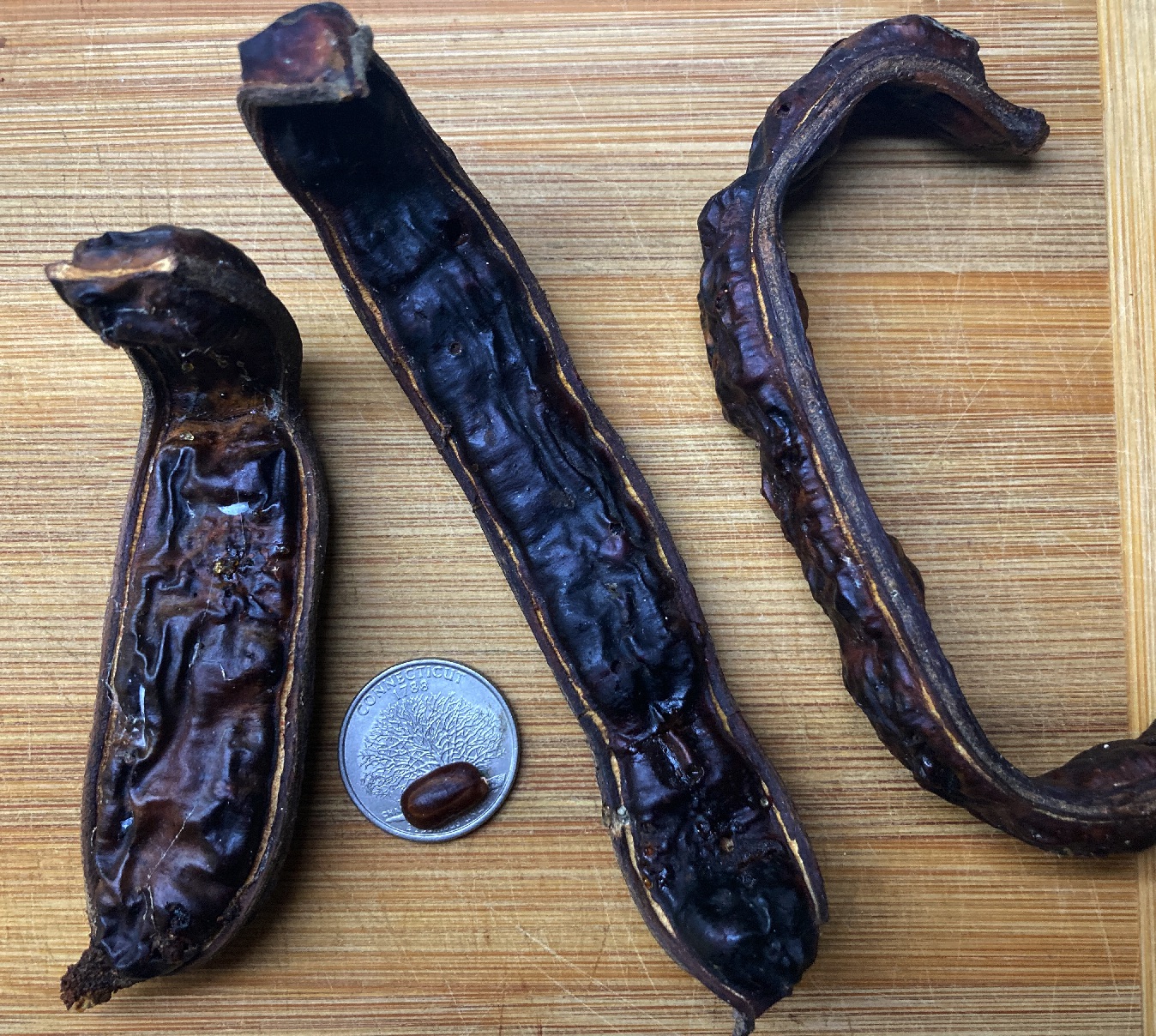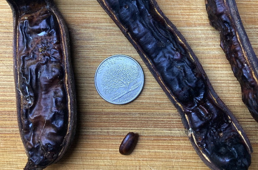 Fruits remain invisible – or at least inconspicuous – for the following seven months. Finally, in late October, tiny shoelace-like green pods make an appearance high in the crown. By early December they have grown to full size (20 cm long by 2 cm wide), but remain green and persist in the canopy until February. Maturing as somewhat flattened, brown pods with narrow, encircling, whitish bands – they rapidly fall to the ground during this month, invariably accumulating underneath the parent tree. Inside each fruit, a sweet-smelling, honey-like resin surrounds a series of hard-coated, dull-brown, ovoid seeds (1 cm). Harvests are seldom annual events, with many trees following two-year or more infrequent fruiting cycles. Seeds show high viability and they germinate easily and rapidly – within a month of the beginning of the rainy season (usually in early May).