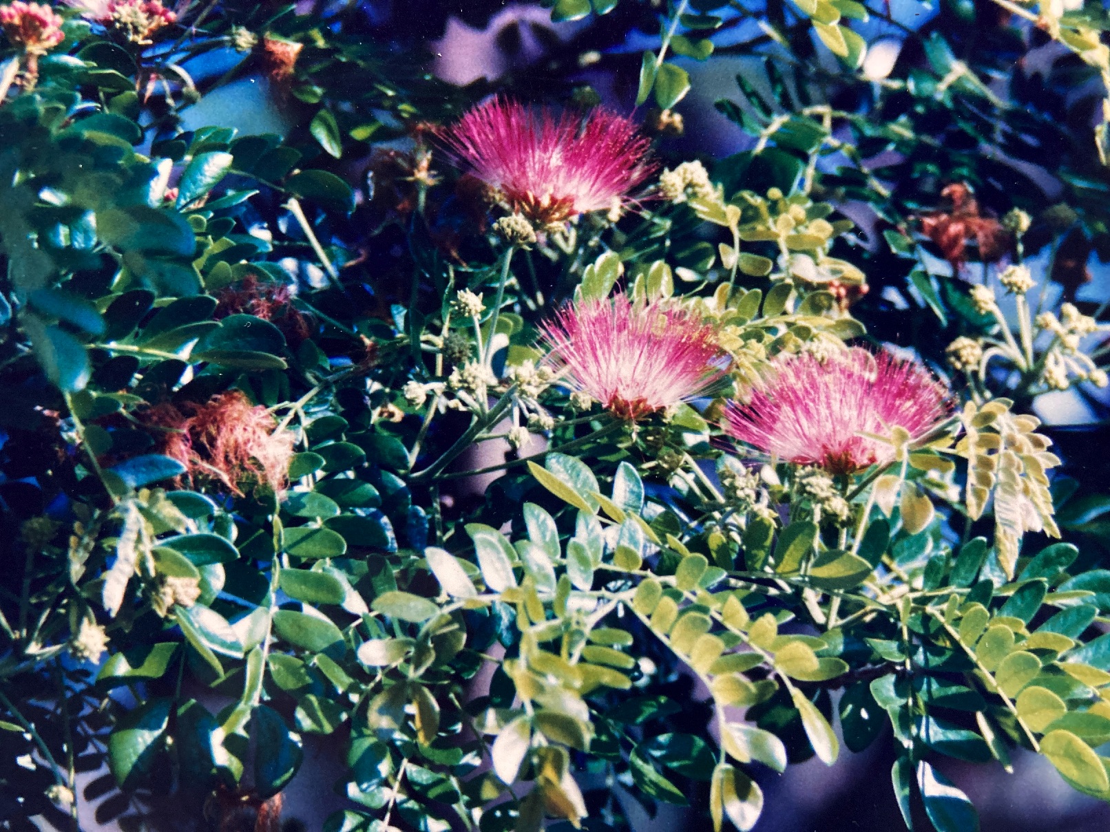 Flowers emerge on axillar spikes as the new leaf coat matures. roughly spherical heads (8 cm) are loosely composed of about twenty tubular flowers and a long (5 cm) pedestal. Individual blossoms sport a small green calyx; a five-pointed, pink corolla; and a bundle of about twenty long (4 cm), pink stamens. It is these abundant and showy filaments that give the Cenizaro flower its most eye-catching characteristic. Splashes of delicate red and pink agreeably dapple the light green of the fresh foliage during the flowering season, which lasts from mid-March through mid-May.