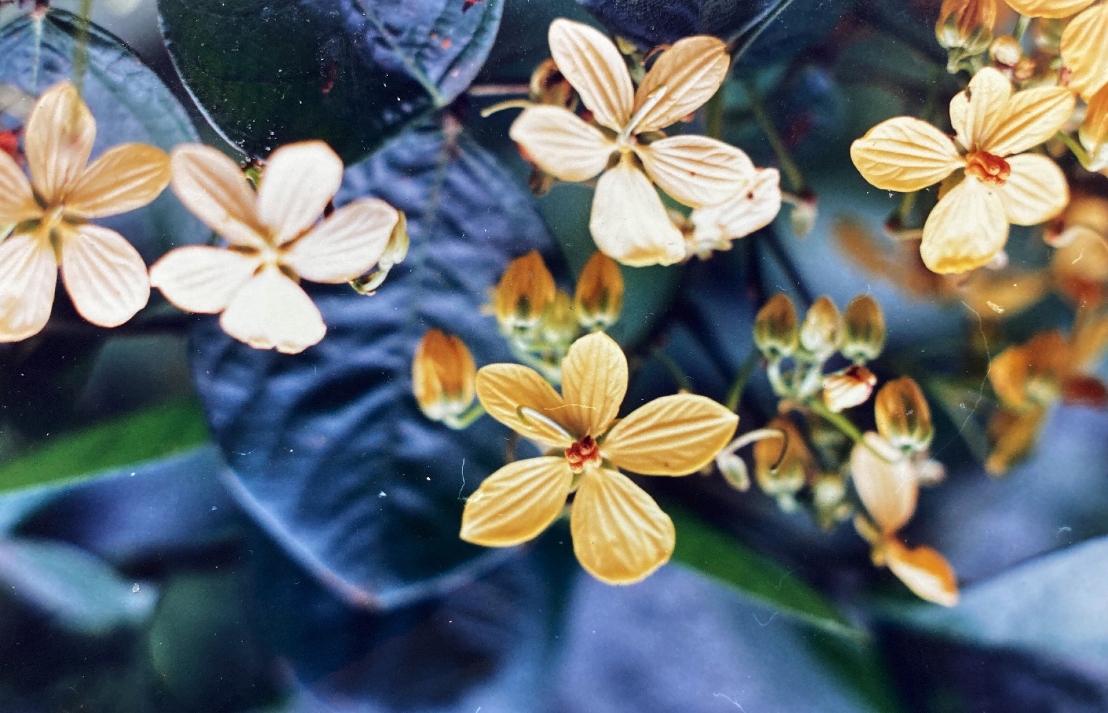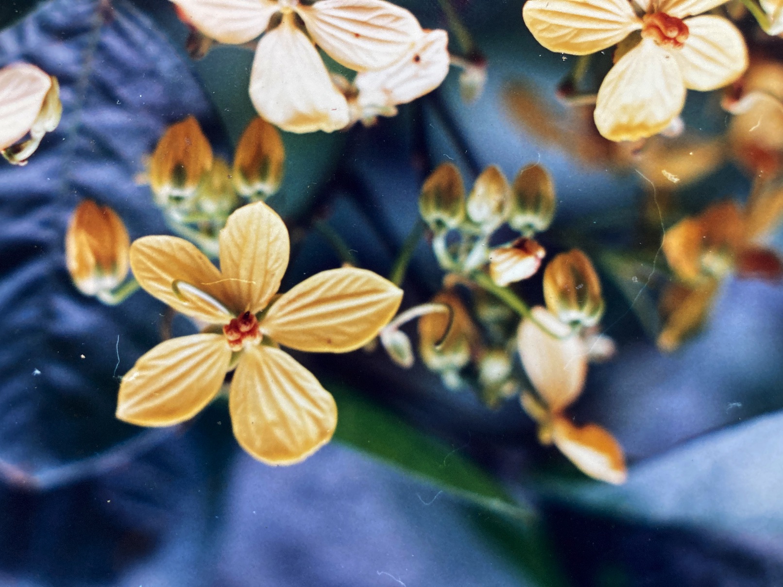 This growth spurt continues until September or October when terminal panicles of flower buds appear on the branch. Soon, large clusters of cascading, yellow flowers (3-4 cm in diameter) adorn the ends of the limbs. Each blossom is composed of 5 small, brown sepals; five darkly-veined, yellow petals; four short, fat-anthered stamens; and a single long, curved pistil. In form, they strongly resemble most other flowers of the large Senna genus. Blossoming lasts from September through early December.