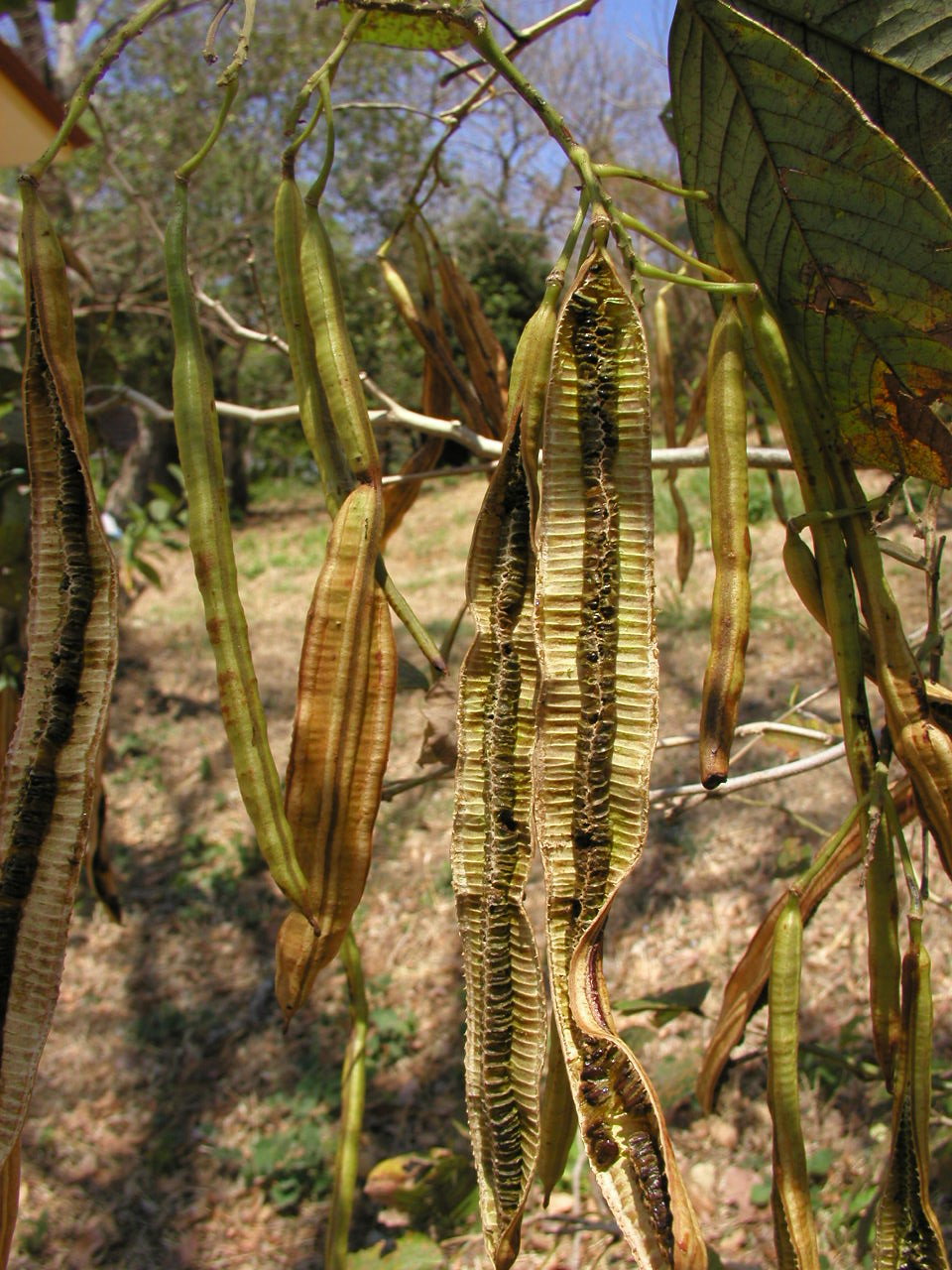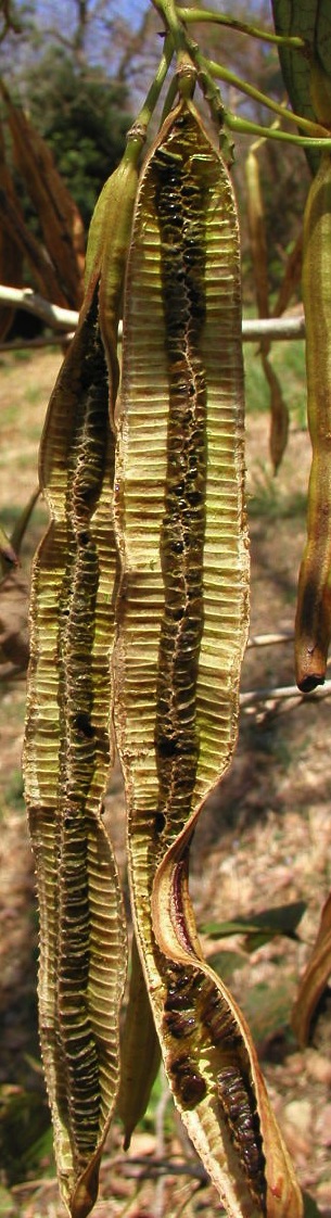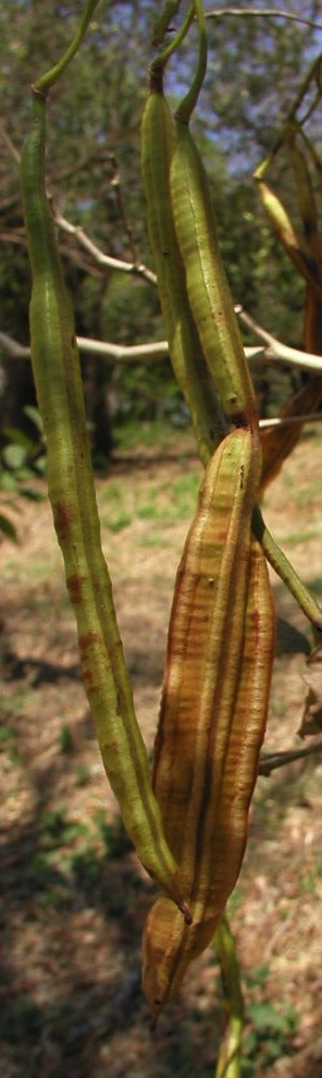 Fruits are long, bean-shaped pods (30 cm by 1 cm) that can be seen dangling from the tips of the branches. They develop rapidly from the remnants of successfully pollinated flowers, first appearing in November or December. Cylindrical and woody, the pods are organized into hundreds of small, transversely oriented compartments that contain equal numbers of small (2 – 3 mm), angular, and glossy seeds. When the fruit matures, it browns and dehisces longitudinally, allowing the seeds to fall to the ground. Fruiting occurs in February.