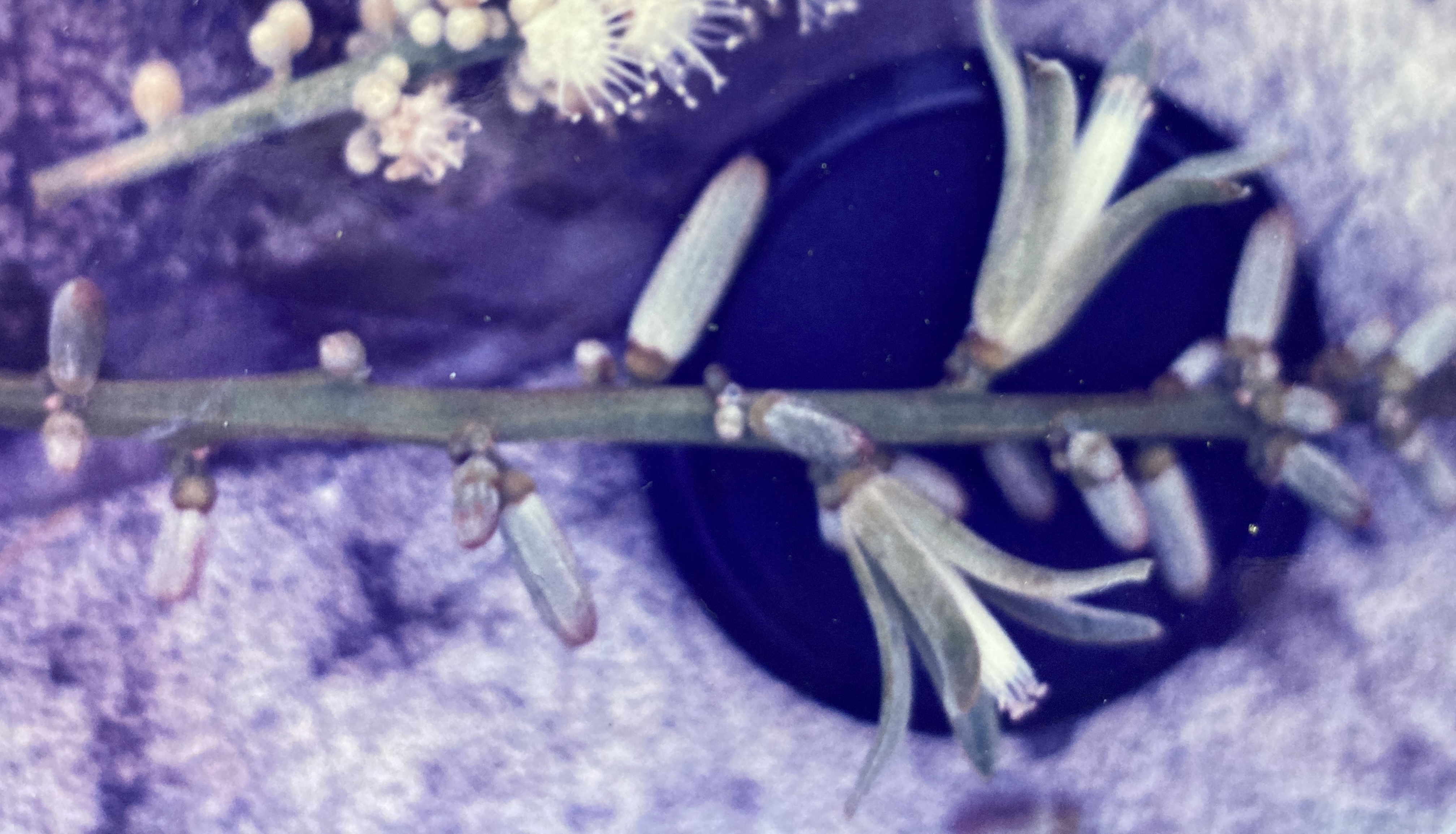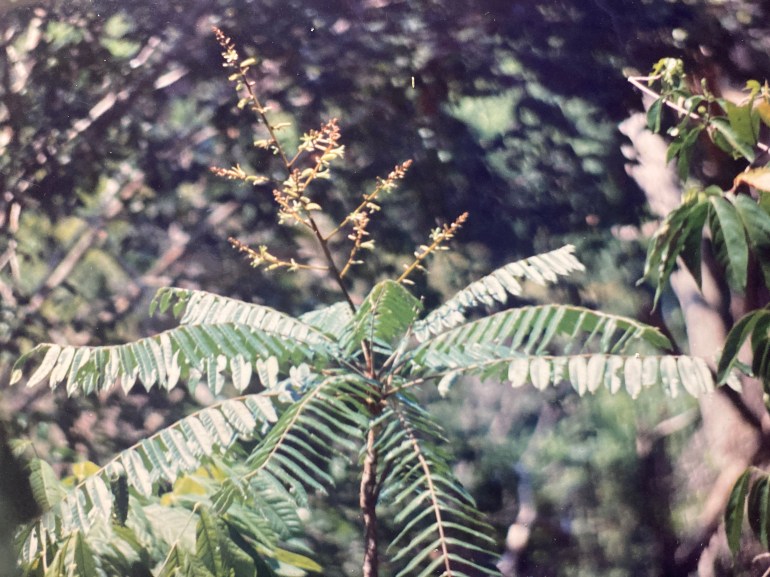 Description: Cedron has a mostly cylindrical, straight trunk of slight girth (generally less than 20 cm but occasionally exceeding 30cm in diameter). Taller trees are remarkable for their long, slender, slowly tapering monopodial boles. Though branchless, the single trunk may occasionally subdivide into several secondary trunks. Cedron bark is smooth, gray, and generally covered with lichens of different pastel colors (e.g. white, pink, green). Leaves are compound, imparipinnate, alternate, and very large – sometimes reaching up to a meter in length. Composed of 31 or so oblong leaflets (15 cm by 5 cm), they are a dark, glossy green color. The outstretched leaves are densely clustered at the very top of the tree where they create a characteristic and unmistakable, umbrella-like tree form. Foliage is completely shed in October and new leaves – red and supple – emerge in November and December. During this process, the rapidly growing leaf petioles extend vertically upwards as a group and then open outwards – unfolding as an upside-down umbrella. Flowers are borne on large (60 cm), terminal panicles that emerge from the center of the leaf whorl at the apex of the tree. They are pale green, 2.5 cm long, and sport a set of five tomentose, narrow petals that surround a tube formed from the fused filaments of the various stamens. A small, cup-shaped calyx and hidden, centrally located pistil are the blossoms other major features. Flowers are observed from March through June, though individual plants may only be fertile for a fraction of this time. Fruits are large (7 cm by 4.5 cm), peach-like drupes with a mottled olive-green and maroon, velvety outer skin and a thin layer of orange flesh covering a single large (6 cm), white pit. A typical tree may produce five or so fruits annually, and these become so heavy that they bend the long stalk to which they are attached and end up dangling vertically from it. Ripe fruits are observed from late June through August. Seeds germinate in the wet, rainy-season soil within one month of fruition.