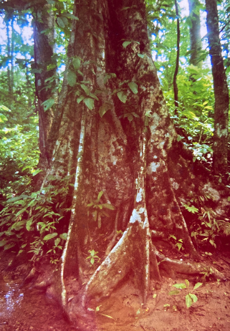 Description: When mature, the Sloanea trunk is stout and very irregular. Accenting its imposingly large stature, high (1.5-2 m), thick, and wall-like buttress roots protrude from its base and extend away in all directions. Branching occurs only along the upper third of the bole and the crown produced by them is thick, vividly green, and finely textured – though often haphazardly shaped. Bole bark is light gray or off-white and scaly in appearance while that of the thin twigs is brown with white lenticels. Ira Rosa leaves (8 cm by 3.5 cm) are simple, alternate, smooth and small. Shed and re-grown in May and June, the forest floor may be covered with them during this time. They are of variable and often asymmetric form, thought generally elliptical and with slowly narrowing (caudate) apices.