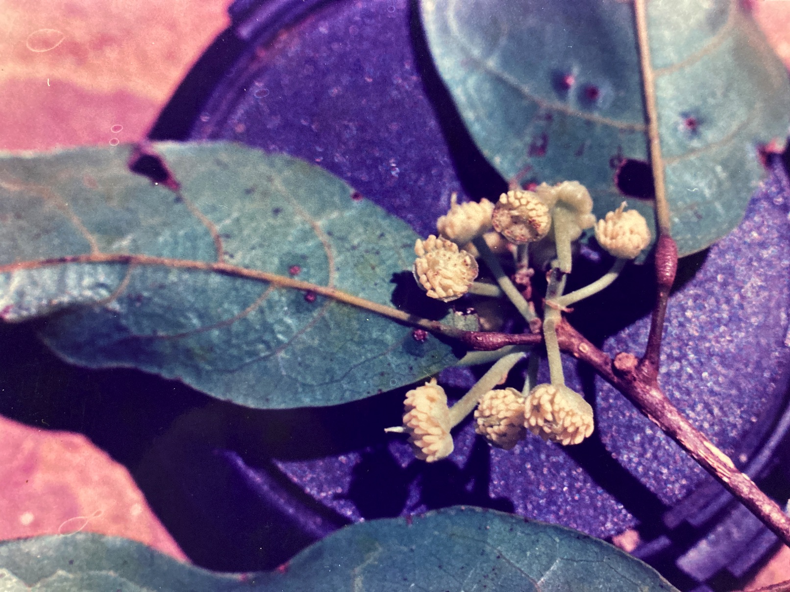 The small (4 mm), yellow, petalless flowers occur in axillar clusters. Each is dominated by a tight, brush-like bunch of yellow stamens that protrude from a basal disk and that surround a longer green pistil. After blossoming, these stamens are shed and the flower ovary begins to expand rapidly into the characteristic spiny pod. Flowering periods are short and their annual timing is inconsistent. Typically spanning a two-week period, flowering occurs sometime from October to January. As previously mentioned, the fruits (2.5 cm) are rigid, woody capsules covered by sharp spines. Ripening as they change from green to a striking violet/maroon color, they dry high in the canopy and split into 4 or 5 irregular, petal-like sections. Inside, a seed, cloaked in a bright orange aril, is exposed. It remains attached to one of the opened sections of the capsule until it is foraged by a small mammal or bird. Each fruit contains a single white seed protected only by a thin, papery seed coat. This unprotected seed germinates immediately upon reaching the forest floor: an event that is appropriately timed to correspond with the beginning of the rainy season. Harvest lasts from late February though April.