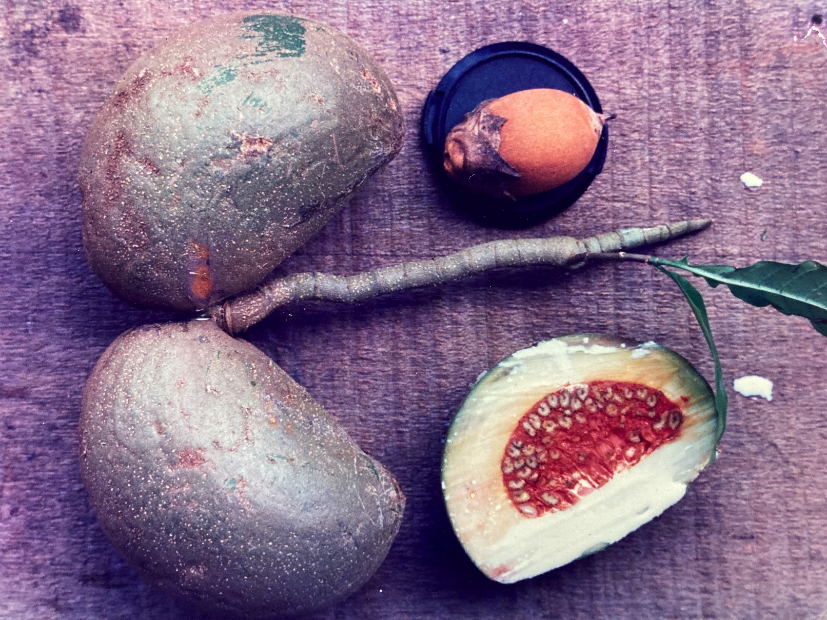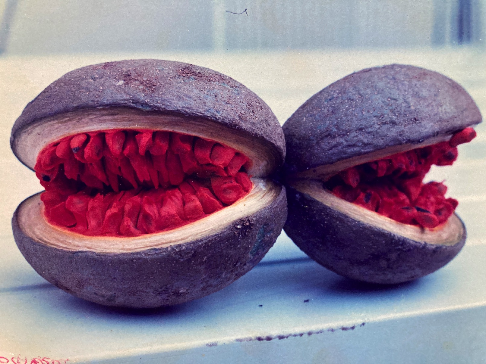 The first few small fruits do not become visible in the crowns until about August and they continue to accumulate and increase in size until the end of the flowering season. With the earliest reaching full size (11 cm) by January, the heavy fruits mature as green, paired, asymmetrically curved capsules bearing a longitudinal seam along their inferior margin. Eventually, they split open along that seam and expose a hundred or so small seeds (4 mm), each covered with a striking, bright-orange aril. Fruition lasts from mid-March until late June.