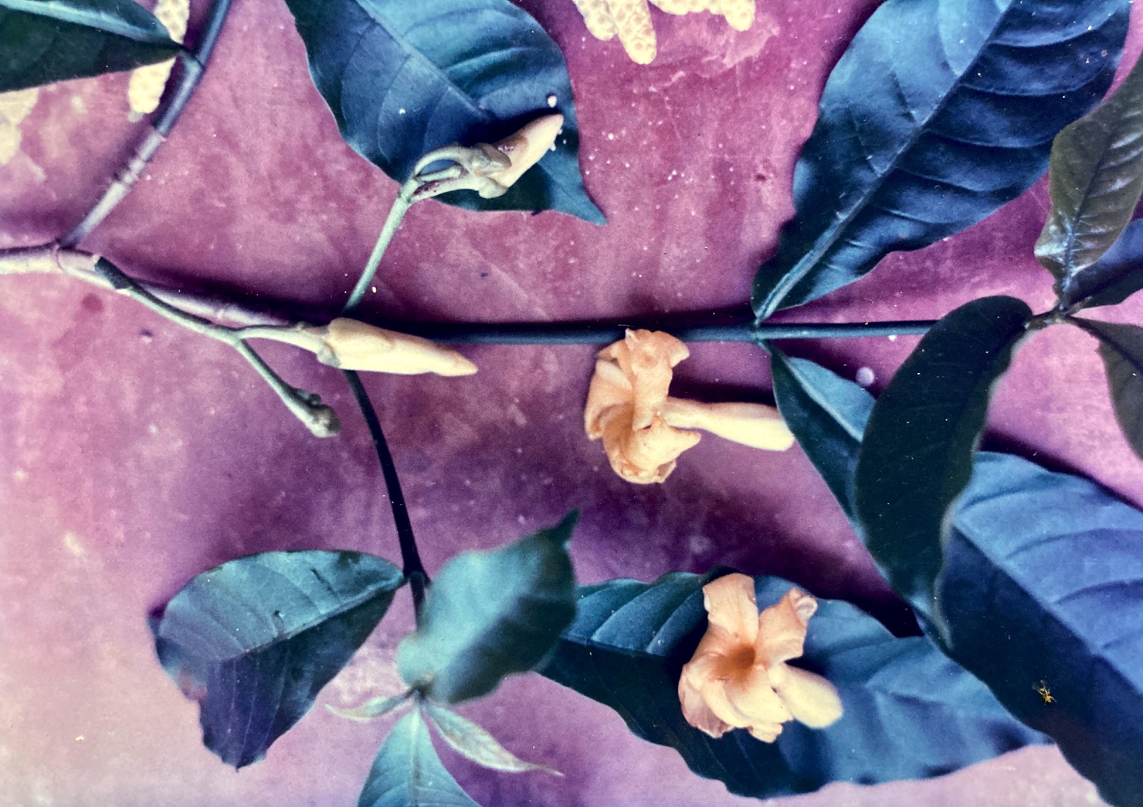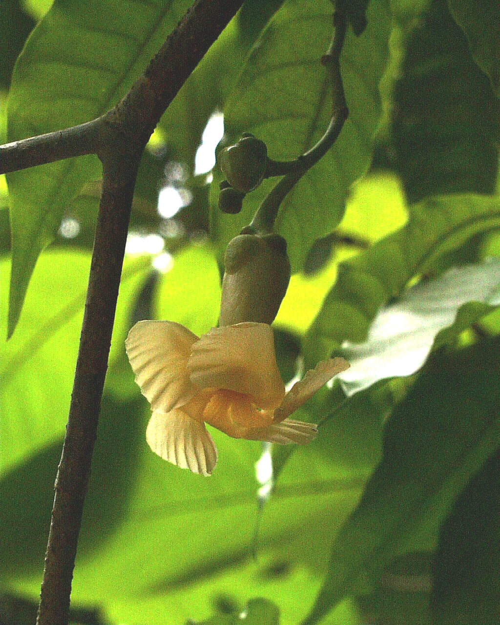 Large, pale yellow flowers (5 cm by 3 cm) are borne from leaf axils in clusters of about three blossoms each. Each is composed of a narrow corolla tube that flares outward, trumpet-style, into five spirally arranged petals. An equal number of pale green or white, scaly sepals completes the perianth. Blossoms appear over an extended period, lasting from late February until the end of November – only ceasing for a couple of months during the early portion of the dry season.