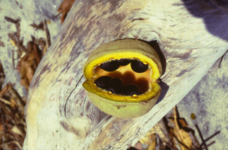 Within a couple of months of flowering, fruits become visible high in the canopy. They initially resemble small (1 cm) knobs, positioned at the ends of stiff, twig-like pedestals. For the following six months, fruit development appears to stagnate, for there is little external change notable from the ground. Finally resuming rapid growth, the fruits become full sized, woody pods (10 cm by 6 cm) some ten months after flowering has ceased. (They begin to harvest only after a full year has passed). Clustered in heads numbering from 1 to 7 (usually 3-5), the pods are arranged in a radially-symmetrical whorl (spoke-fashion) around the supporting pedestal. As they desiccate in the dry season sun, the pods ripen and their velvety skins turn from green to maroon or brown. Eventually, each pod ruptures along a longitudinal seam and twists open, revealing a stunning, bright orange-yellow interior. Do not be deceived – though attractive, this inner surface is lined with innumerable, fine (almost invisible), sharp, glassy spines. With no more than the slightest touch, dozens of these irritating, fiberglass-like shards puncture and the skin and cling to it – becoming nearly impossible to see, much less remove! Five or six football-shaped, black seeds (2.5 cm by 1 cm) are anchored to the edge of the pod along the open seam. Each is covered with a thin, black, fleshy aril.