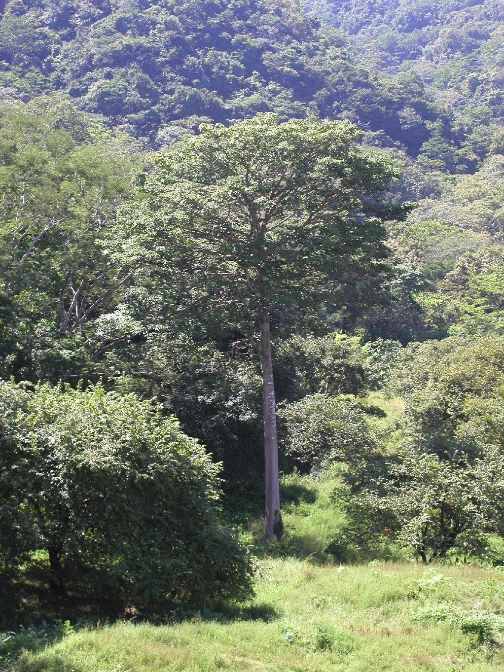 Leaf hairs reduce the flow of air over blade surfaces, decreasing the evaporation of water from epidermal tissues and stomas. Thus, Panama’s thick, pubescent leaves probably help it conserve water during times of drought – an adaptation that also enables this tree to survive in sandy, beachside soils. The folded, three-dimensional nature of Panama blades helps to generate a fuller crown, perhaps partially compensating for the lack of extensive branching seen in this species. Leathery and thick, dead Panama leaves are resistant to decay, and they often form a persistent, ground-blanketing layer on the forest floor. Since Panama leaves are shed at the beginning of the dry season, it is interesting to speculate whether this might not be an adaptation intended to help conserve ground moisture by reducing evaporation from the soil surface. Perhaps significantly, the only other large-bladed leaf species present in Manuel Antonio (Brosimum utile and Terminalia catappa) exhibit similar leaf-shedding behavior.