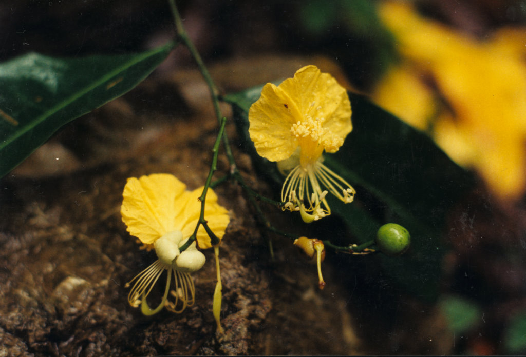 Description: Naranjillo has an angular and bending trunk with a circular cross section. Its bark is smooth and brown. Branches emerge from the upper half of the bole and produce a narrow crown whose thickness is strongly habitat dependent. Deep forest trees, receiving little direct sunlight, tend to possess thin crowns that are open and irregular in form. However, where insolation levels are higher, this species can develop a thick, symmetrical, and full canopy of leaves. Alternately arranged and appearing to be simple, Swartzia leaves in fact possess the reduced remnants of a second leaflet (0.5 cm) at the base of the petiole and are thus classified as compound. The blades of the principle leaflets (16 by 5 cm) are smooth, thick, and stiff. Of overall elliptical form, they vary in their degree of eccentricity, with some blades quite rounded but most others narrow and elongate. Dark green in color and possessing a fine network of secondary venation, leaflets may or may not sport short drip tips. Their margins curl downwards, forming a narrow, encircling lip. In drier sites, the distal fringes of the blades yellow, dry and chip away. About 20% of the foliage cover is renewed during each of a series of growth spurts that occur randomly during the year.