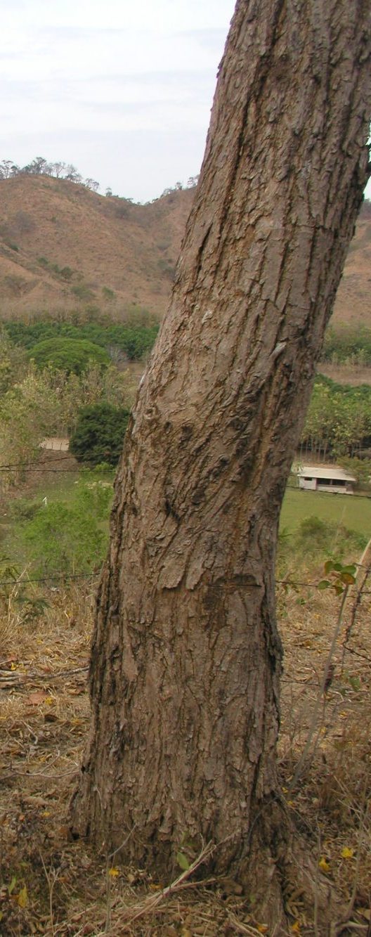 Description: Corteza has an often irregular, bending trunk that is covered by light-colored, yellowish-brown bark. Textured with shallow fissures, this bark is one of the most useful identifying features of this species. Rarely, large trees may reach 60 or 70 cm in diameter. Branches, emerging from the bole nearly horizontally, generate a fairly open crown.