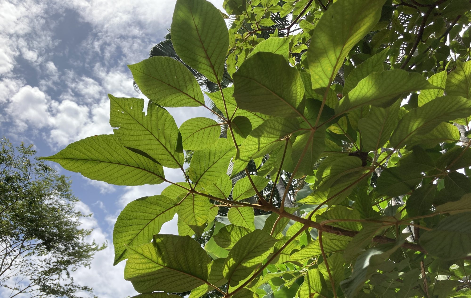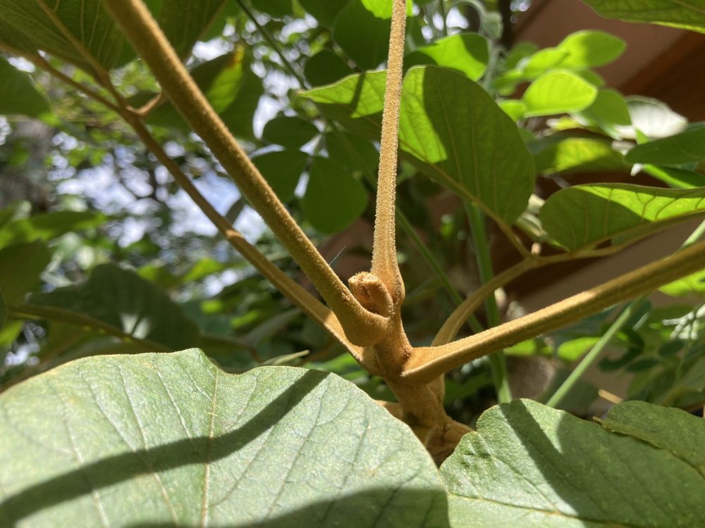 Corteza leaves (20 to 25cm in length) are palmately compound and opposite. These leaves share their unique shape with other members of the Tabebuia genus. Each is composed of a long petiole (12 cm) supporting five, elliptical leaflets of varying size: the three distal leaflets (10 cm by 5 cm on 4 cm petioles) being about twice the size of the proximal two (6 cm by 4 cm on 2 cm petioles). A thick golden pubescence covers leaf veins, petioles and the distal portions of twigs. Foliage is often retained far into the dry season, and is only shed shortly before flowering occurs. Trees then remain devoid of leaves until the rains resume in May. (As with Roble, the exact timing of these events varies between individual trees and is strongly influenced by the microclimate and soil characteristics experienced by each tree.)