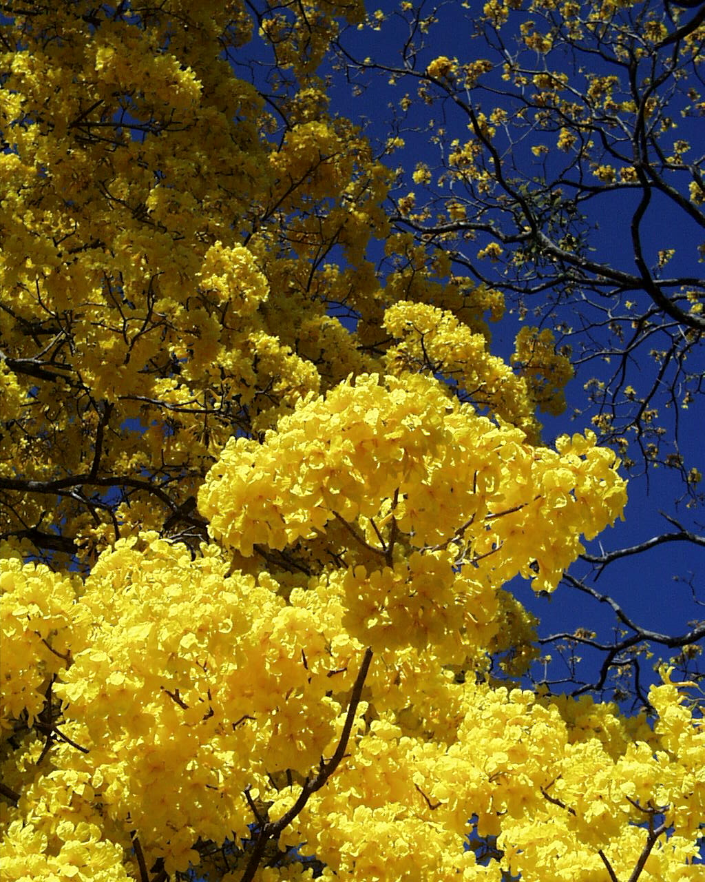 Flowers (8cm by 7cm) are produced in large, terminal panicles during the dry season. Bright yellow, each is dominated by a showy, trumpet-shaped corolla that is formed from the five fused petals. Five stamens and a central pistil adorn the blossom’s yellow center and the whole structure is supported by a cup-shaped calyx. Trees may flower sporadically any time from February to May, but groups of trees in the same region will flower simultaneously. Often, trees will undergo two or three bursts of flowering over the course of the dry season. Each flowering episode is short lived, with blossoms generally lasting less than a week. It is difficult to overstate the beauty of flowering Corteza trees, as their crowns take on a dramatic, brilliant, rich yellow color. Seen against the deep-blue dry season sky, these trees make a memorable spectacle. When in flower, individual Corteza trees can easily be identified from a distance, brightly dotting the forest with their brilliant canopies.