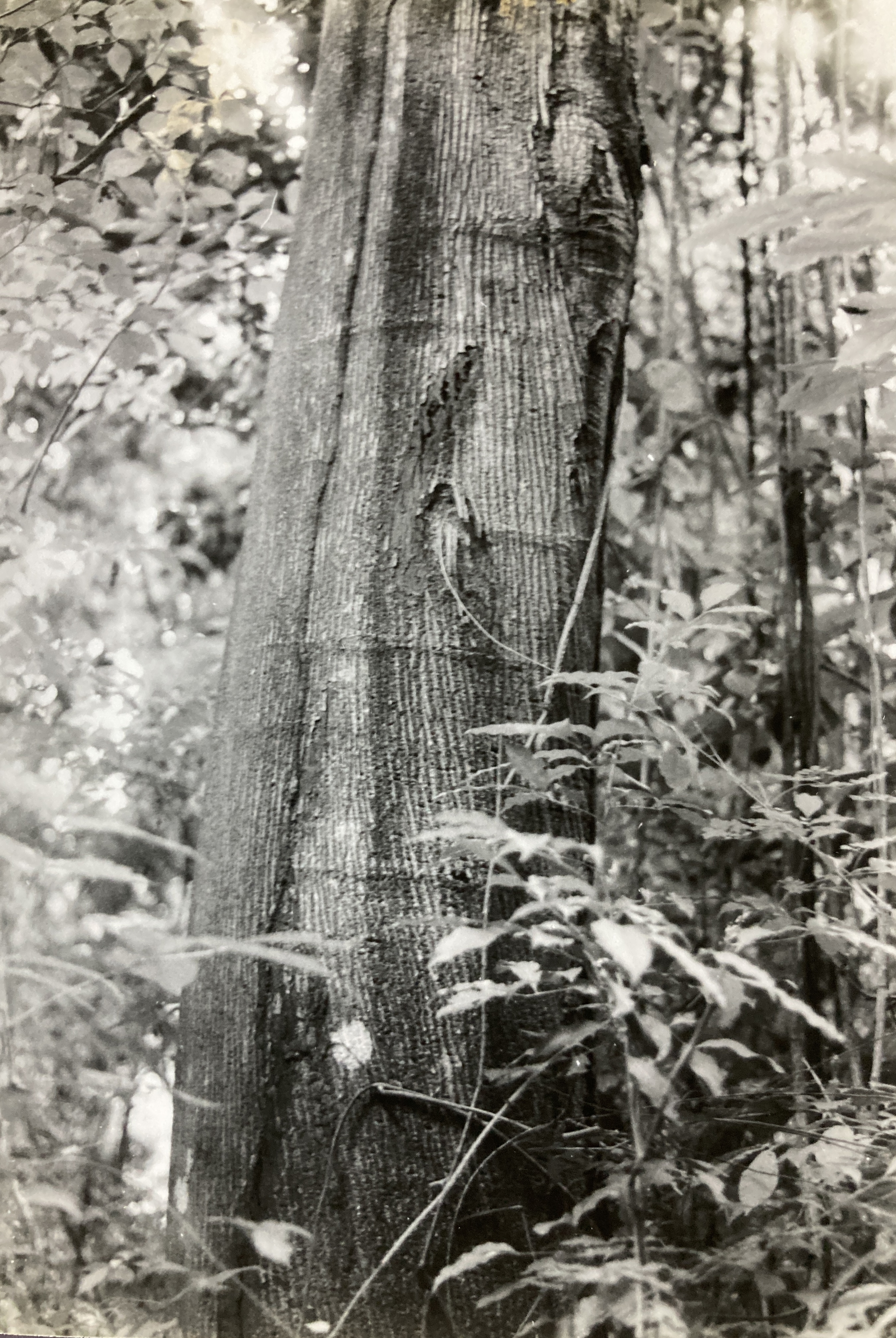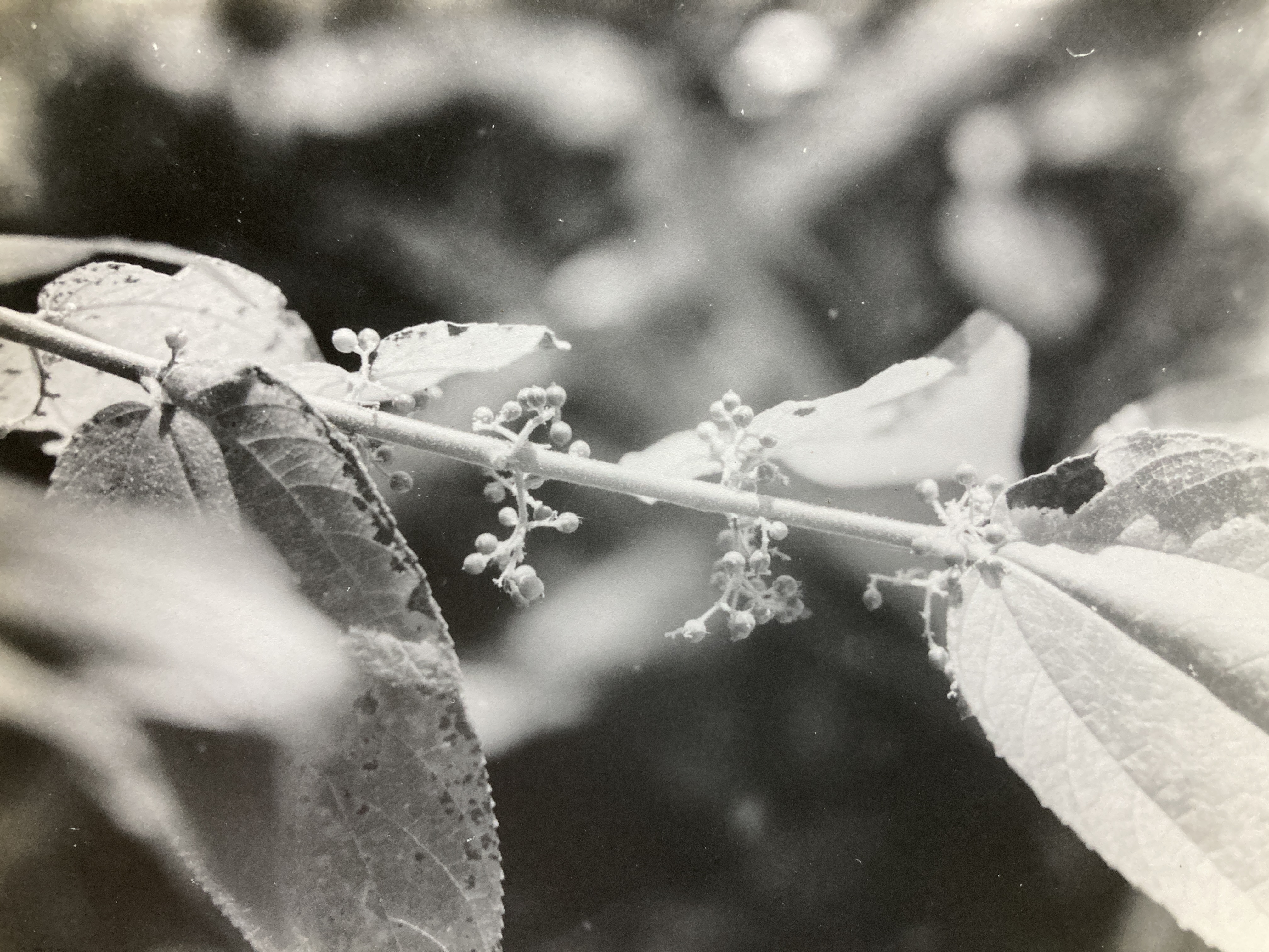 Description: Seen in its usual, treelet form, growing among secondary vegetation, Trema has a thin (10 cm), gray-barked trunk that is arched and bending. A Spartan set of long and wiry branches produce a narrow, open crown and this tree’s overall port is that of a scrawny, short-lived, weed-species. However, on occasion, one stumbles upon Trema amid the more ‘serious’ trees of the primary – or at least old secondary – forest. Here, individuals can attain canopy stature, measuring 30 m in height and 60 cm in diameter. Such relative giants have straight, cylindrical trunks topped with moderately thick crowns and their light gray bark is darkly streaked with closely spaced, fine, vertical fissures. Trema leaves (13 cm by 4 cm) are simple, alternate, and arranged in two tiers along the twigs. The finely serrate (serrulate) blades, supported by 1 cm petioles, are very rough and have the texture of fine sandpaper. Of deltoid shape, they possess wide, unequal (oblique) bases and gradually narrowing, wedge shaped apexes that terminate in long drip-tips. Leaf veins are palmate and they, along with the twigs, are covered with minute, tan pubescence.