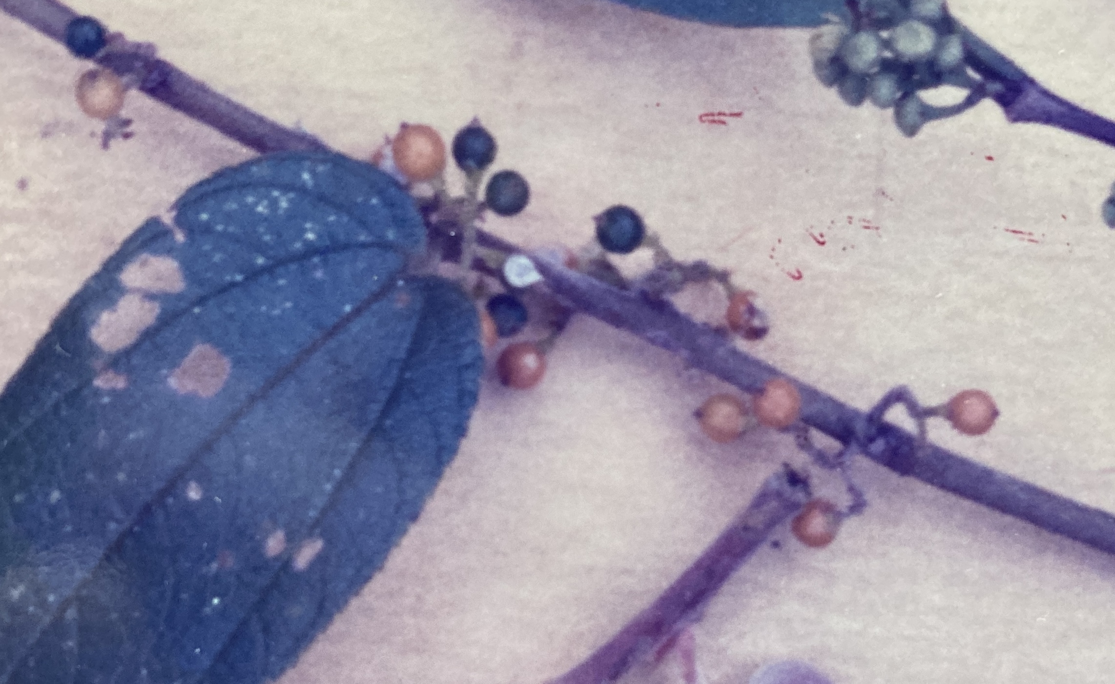 Flowers (3 mm) grow in short (1-2 cm), dense, axillary panicles. Tiny, petal-less, and pale green, each simple blossom consists of five lobe-like, ridged sepals and a central pistil. Five anthers are present, attached to the ends of the sepals.