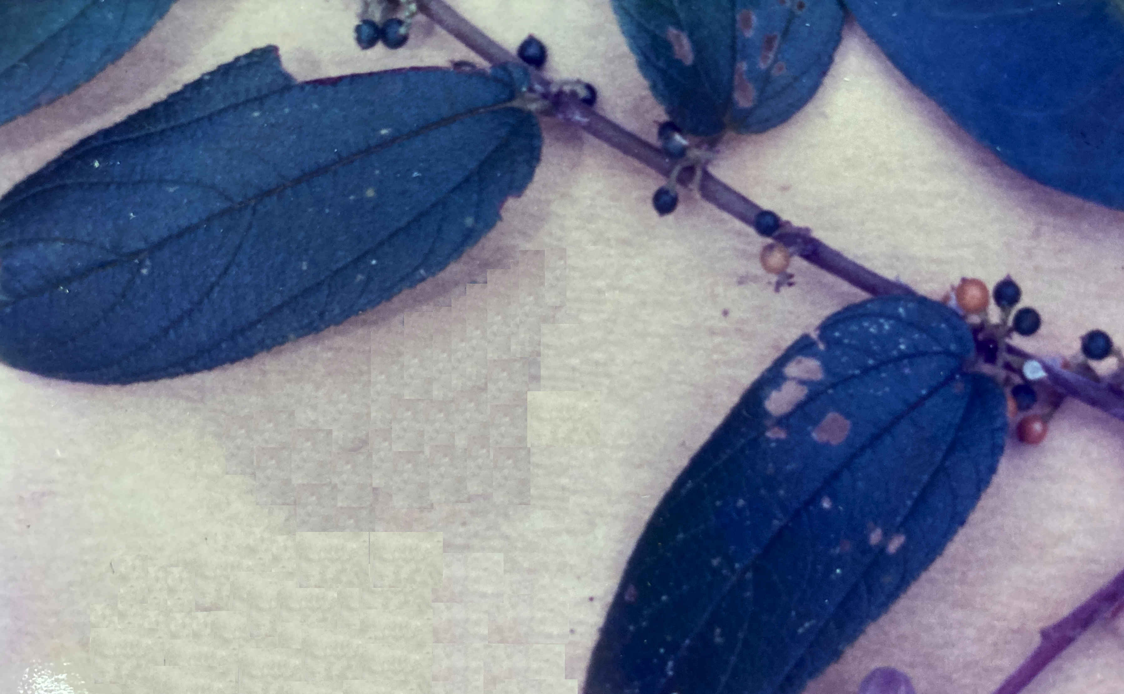 Description: Seen in its usual, treelet form, growing among secondary vegetation, Trema has a thin (10 cm), gray-barked trunk that is arched and bending. A Spartan set of long and wiry branches produce a narrow, open crown and this tree’s overall port is that of a scrawny, short-lived, weed-species. However, on occasion, one stumbles upon Trema amid the more ‘serious’ trees of the primary – or at least old secondary – forest. Here, individuals can attain canopy stature, measuring 30 m in height and 60 cm in diameter. Such relative giants have straight, cylindrical trunks topped with moderately thick crowns and their light gray bark is darkly streaked with closely spaced, fine, vertical fissures. Trema leaves (13 cm by 4 cm) are simple, alternate, and arranged in two tiers along the twigs. The finely serrate (serrulate) blades, supported by 1 cm petioles, are very rough and have the texture of fine sandpaper. Of deltoid shape, they possess wide, unequal (oblique) bases and gradually narrowing, wedge shaped apexes that terminate in long drip-tips. Leaf veins are palmate and they, along with the twigs, are covered with minute, tan pubescence.